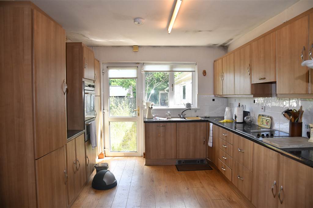 With a range of eye and low level fitted units, stainless-steel sink unit and drainer with stainless-steel mixer tap. Integrated four ring electric hob and oven with hooded extractor fan over. Integrated oven. Integrated fridge-freezer. Integrated dishwasher. Cutlery drawers. Saucepan drawers. Larder cupboard. Splash back tiling. Spacious area for dining. PVC glazed door to rear. Laminated wooden flooring.