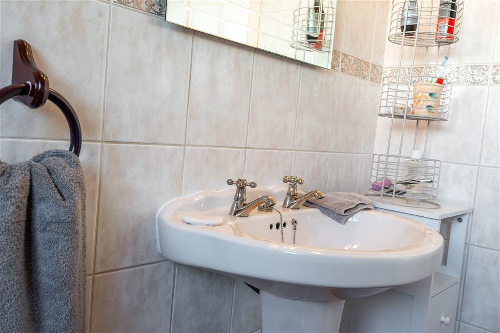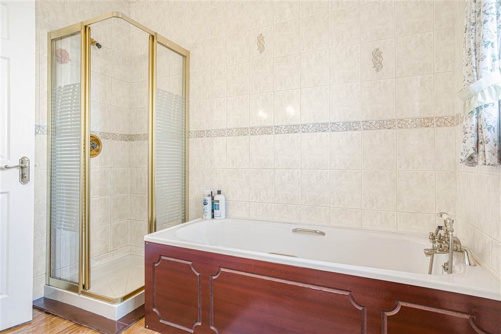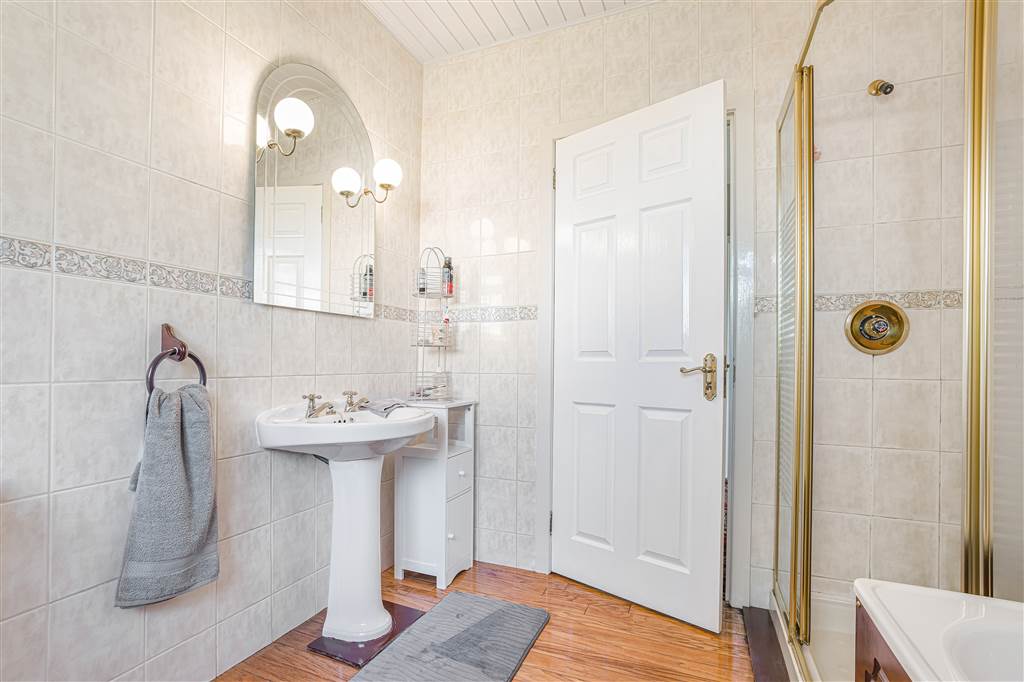 With 4-piece suite comprising LFWC, WHB, panelled bath with hand-held telephone style shower head and shower to enclosed tiled corner cubicle. Tiled walls. Wooden flooring.