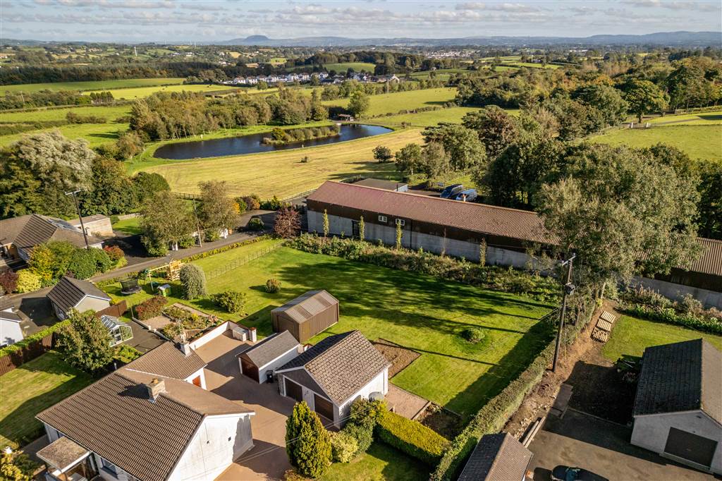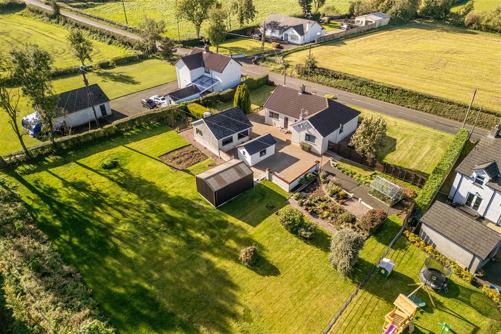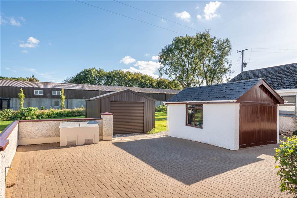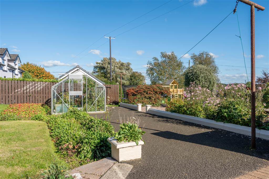 With paved drive leading to spacious paved yard at front, side and rear of property for parking. Well-maintained gardens in lawn to front of property with planted shrubs and hedging. Spacious garden in lawn to rear with planted shrubs. Tarmac area to rear leading to green house and decorative pebbled area at rear with planted flower beds. Outside store. A range of garages and workshop to rear. Site extending to approx. 1 acre. Outside lights. Outside tap.