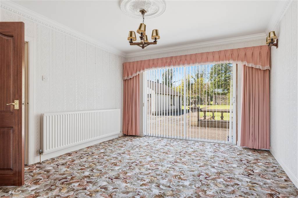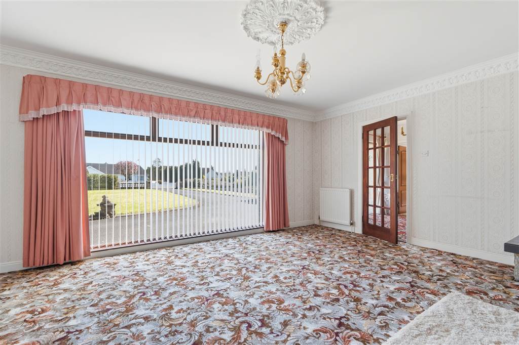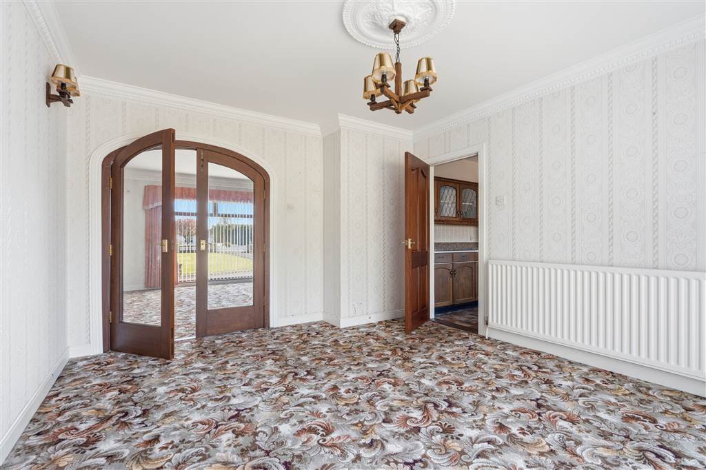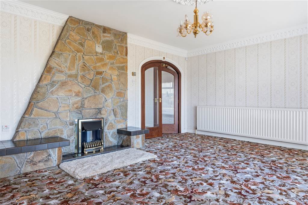 With fireplace to tiled hearth, stone surround and tiled mantle. Ceiling Rose. Coving to ceiling. Feature floor to ceiling window. Double doors with glazed panes leading to dining room.