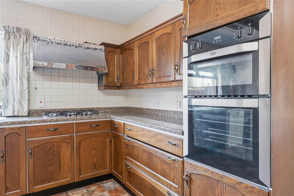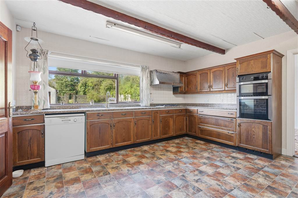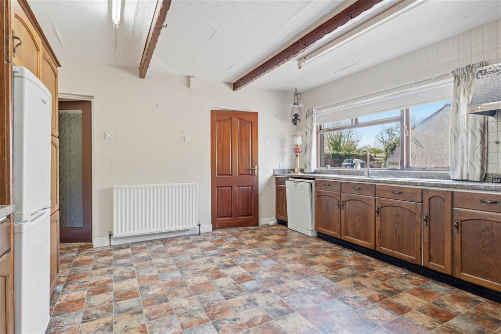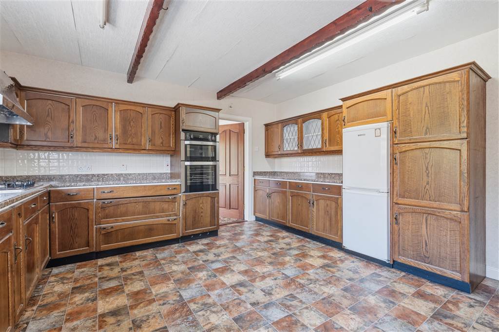 With a range of eye and low level fitted units. 1 1/4 bowl stainless-steel sink unit and drainer with stainless-steel mixer tap. Integrated four ring gas hob with extractor fan over. Integrated electric oven. Plumbed for dishwasher. Space for fridge/freezer. Cutlery drawers. Saucepan drawers. Glazed display cupboards. Splash back tiling. Wooden beams to ceiling.
