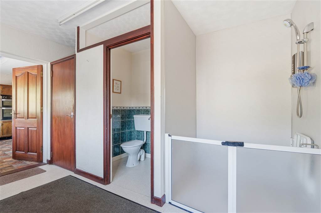 With low level fitted units. Stainless-steel sink unit and double drainer with stainless-steel taps. Wet room style shower. Access to WC. Splashback tiling. Hardwood door leading to rear.