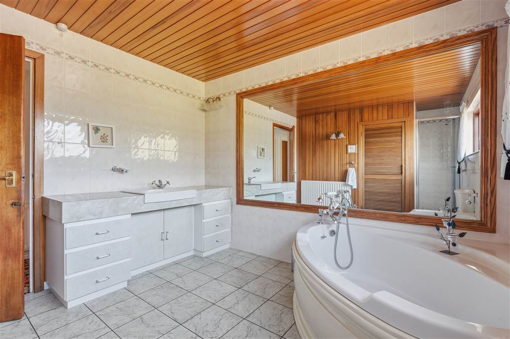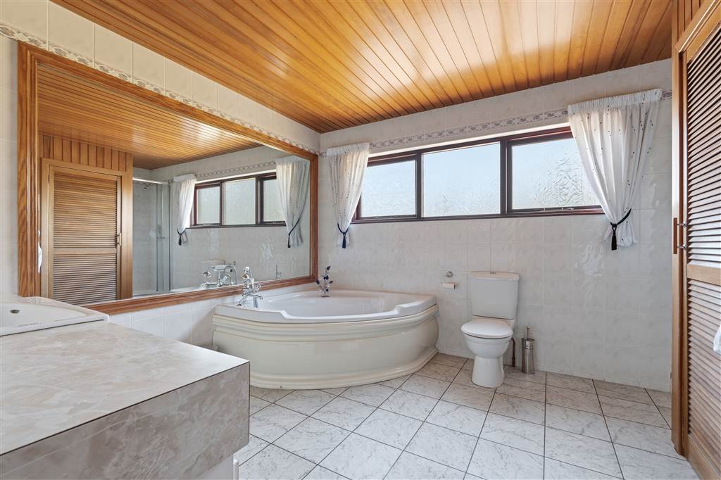 With 4-piece suite comprising LWFC,WHB with built in vanity unit, corner bath with telephone style handheld shower head and shower to enclosed cubical. Hot-press. Wall lights. Tiled walls. Tiled flooring.