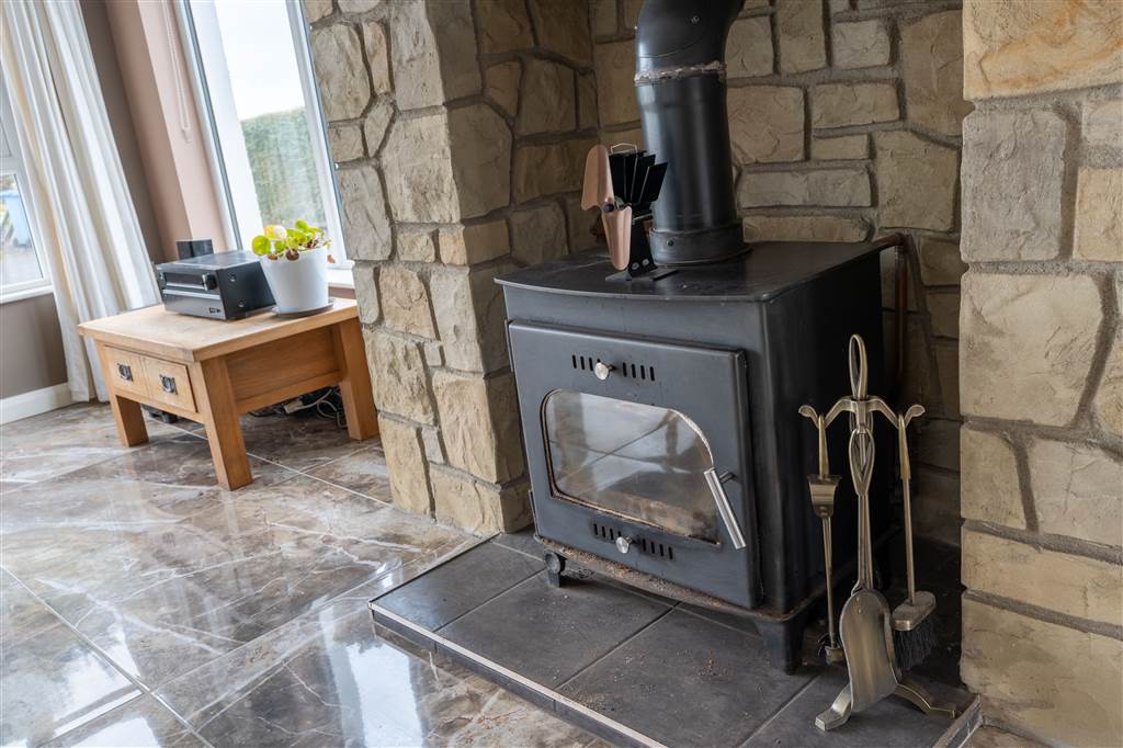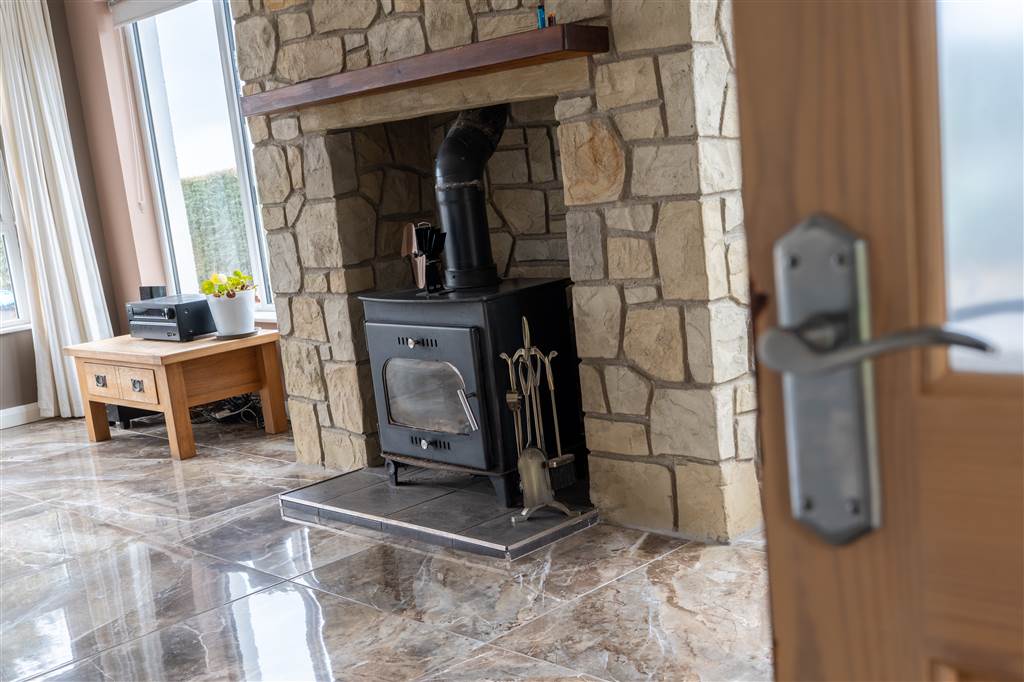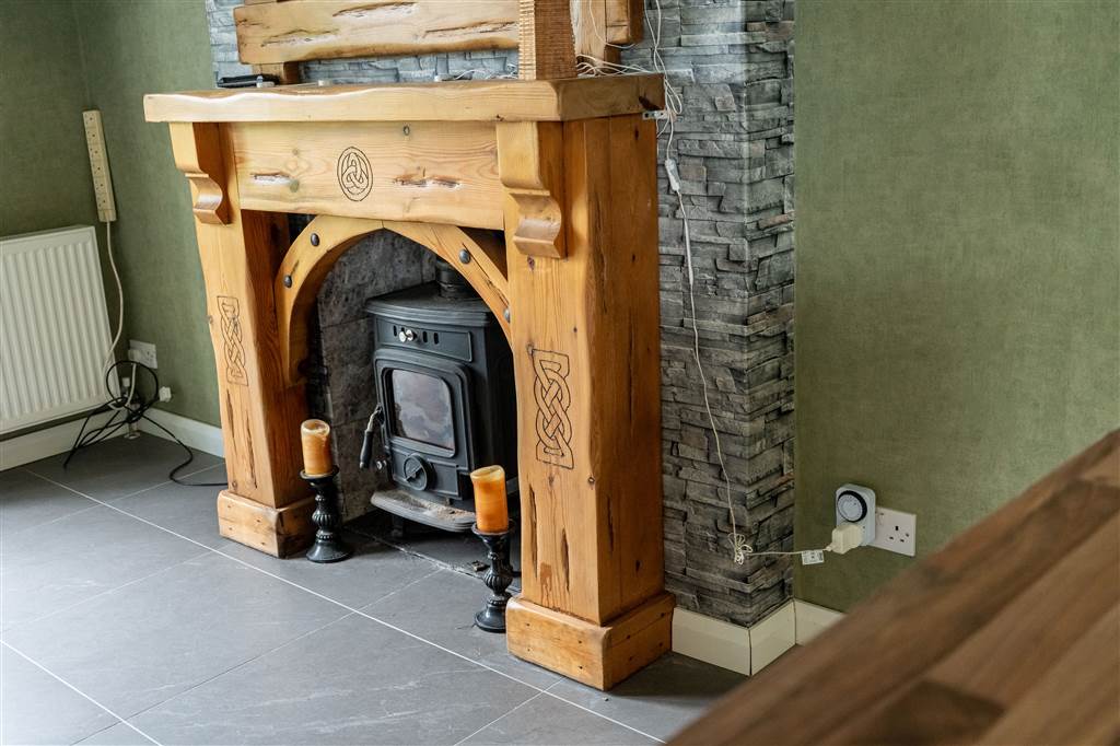 With multi-fuel burning stove to tiled hearth, exposed stone surround and wooden mantle. Staircase to first floor. PVC double doors to rear. Tiled flooring.