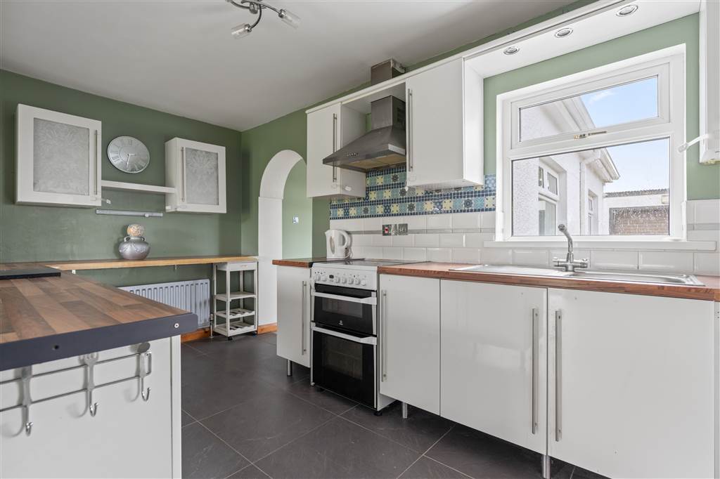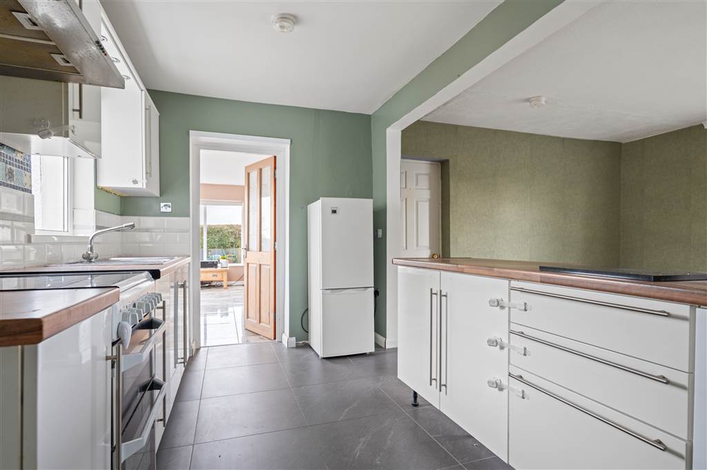 With a range of eye and low-level fitted units, stainless-steel sink unit and drainer with stainless-steel mixer tap. Space for four ring electric hob and oven with stainless-steel extractor fan over. Space for fridge-freezer. Cutlery drawers. Saucepan drawer. Splash back tiling. Tiled flooring. Archway to family room.