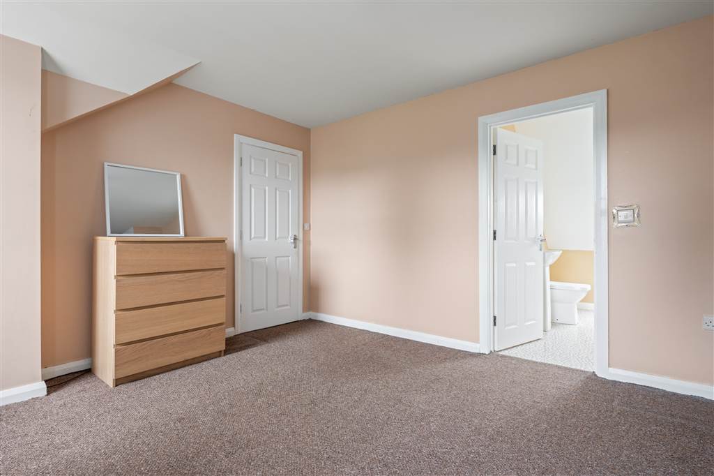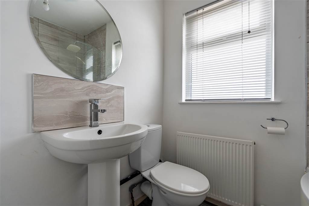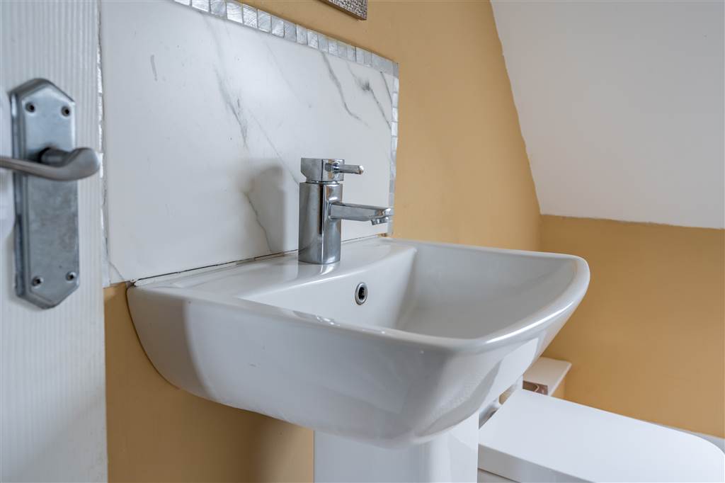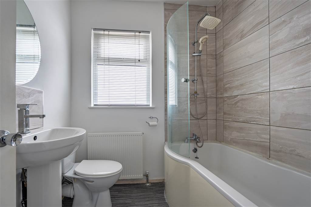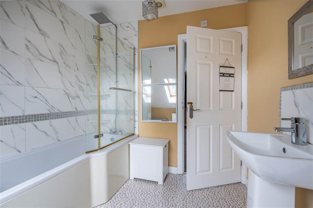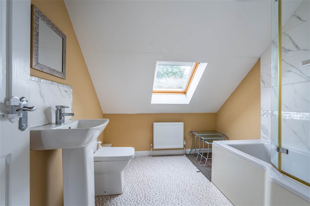 With 3-piece suite comprising LFWC, WHB and P-shaped bath with shower over. Splash back tiling. Velux window.