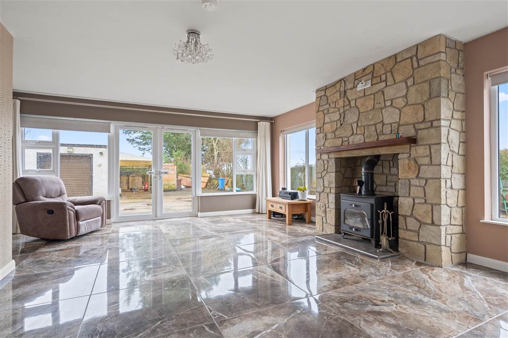 With multi-fuel burning stove to slate hearth, wooden surround and mantle. Coving to ceiling. Ceiling rose. PVC double doors to front of property. Tiled flooring. Open plan to kitchen.