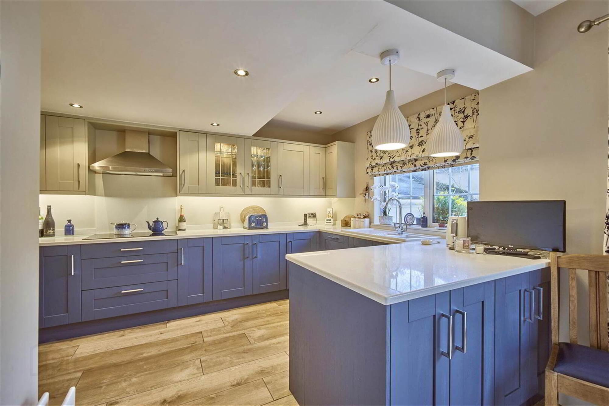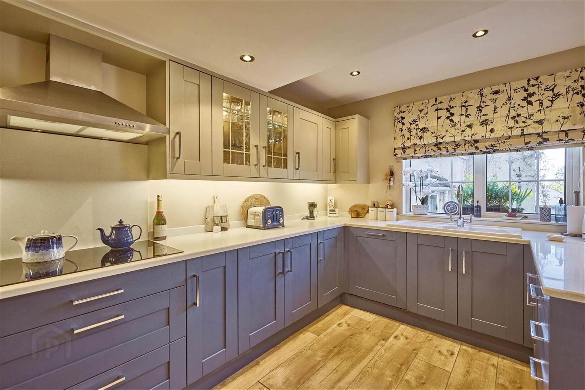 Wood effect ceramic tiled floor, excellent range of high and low level units with quartz worktops. Four ring ceramic hob with extractor fan, built-in fridge/freezer, built-in Bosch electric oven and grill, integrated dishwasher, ceramic sink unit with mixer tap and drainer. uPVC double glazed double doors to rear patio.