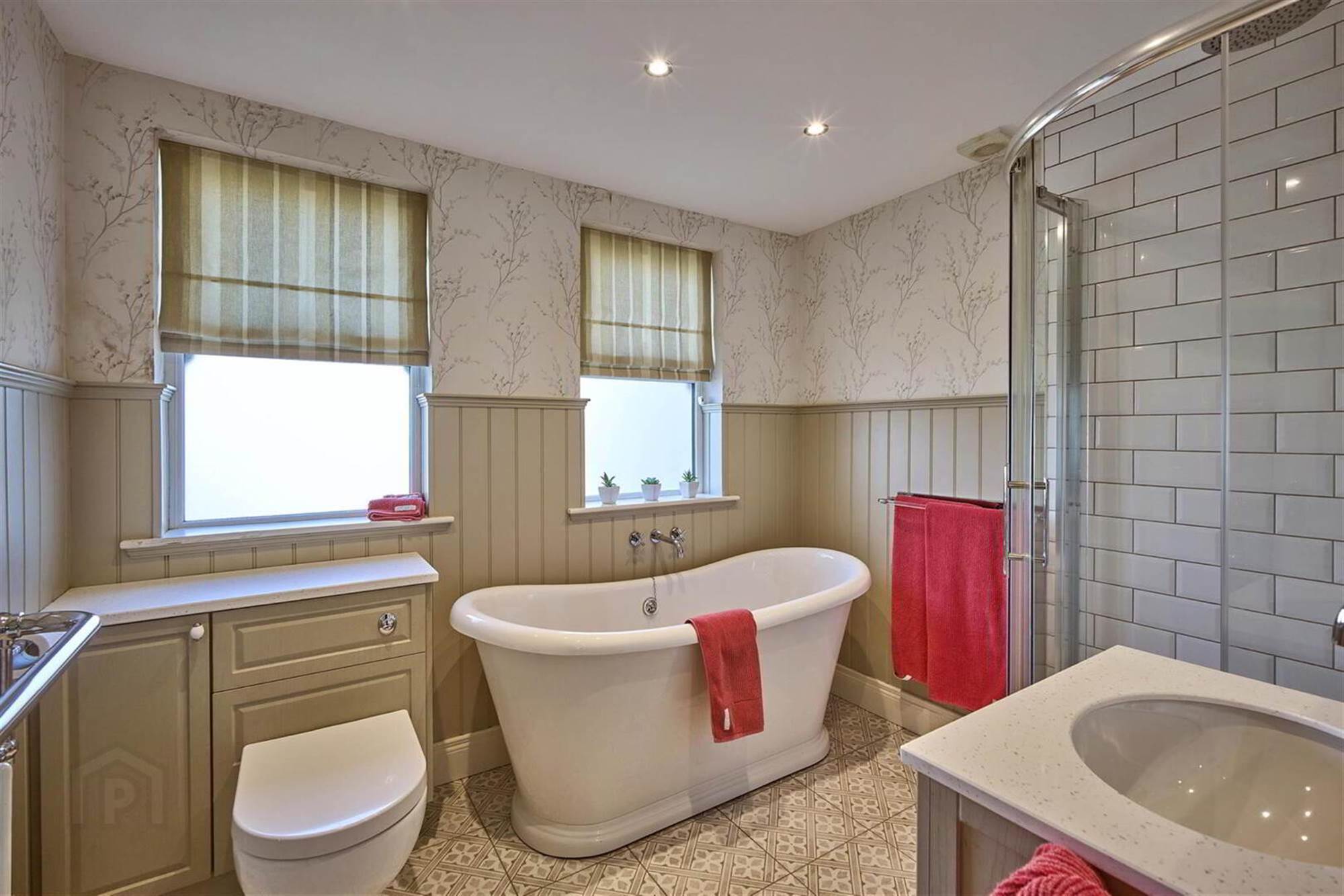 Panelled walls, ceramic tiled floor, vanity unit with mixer tap and tiled splashback, low flush wc, free standing roll top bath with mixer taps. Fully tiled built-in shower cubicle.