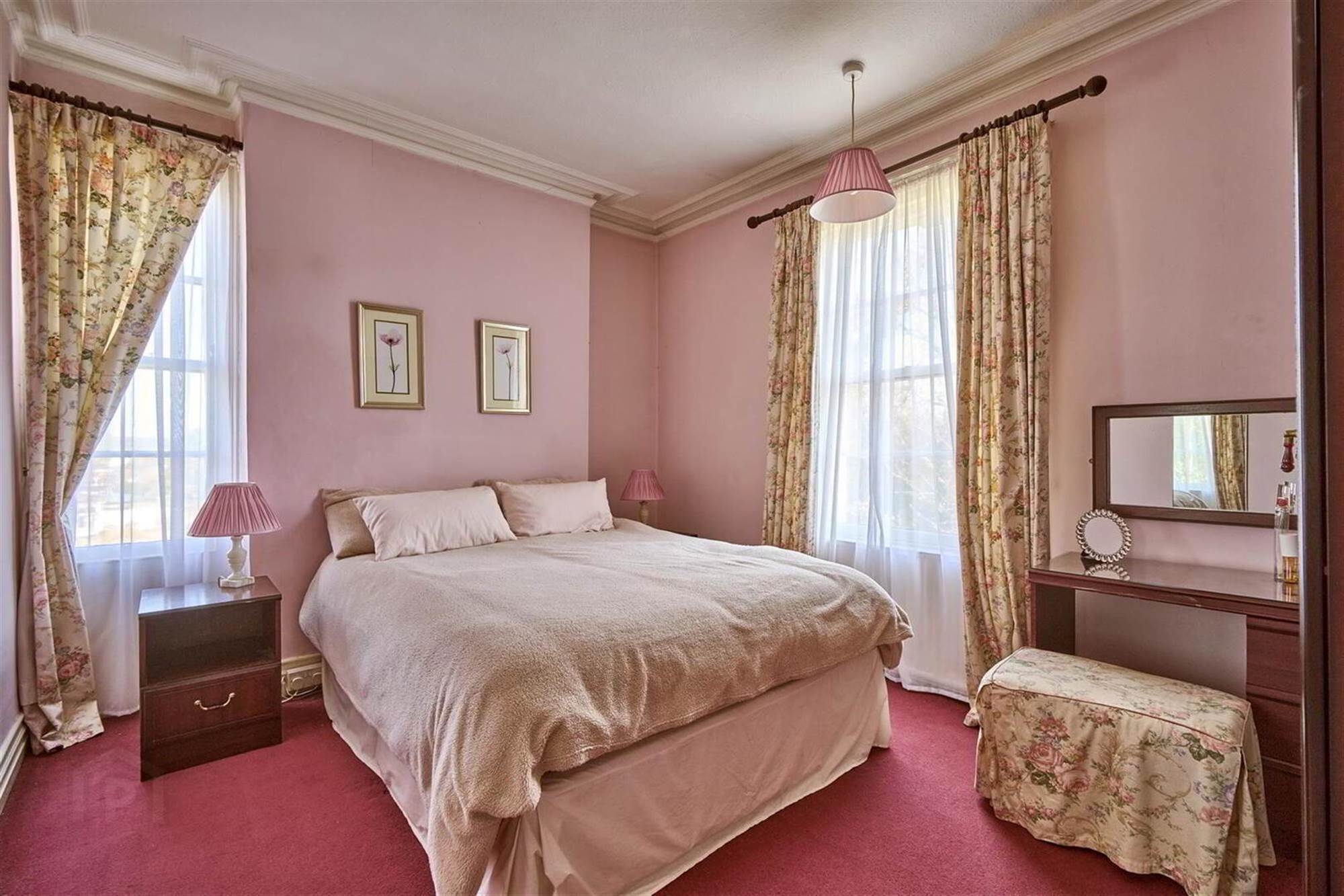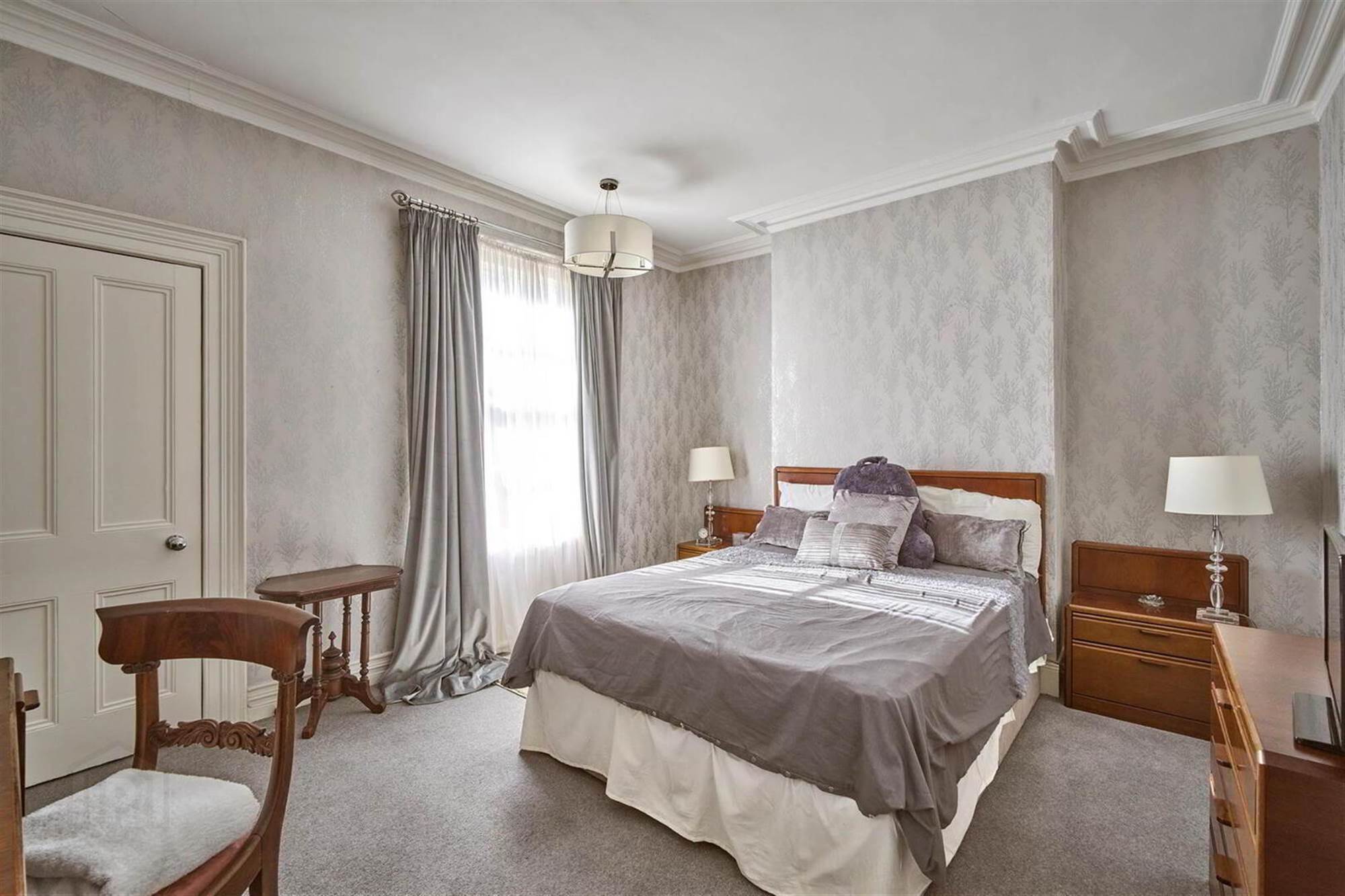 (into bay). Corniced ceiling, picture rail, sliding sash windows, bay window. Carved fireplace with tiled hearth, brass canopy and wooden mantle.