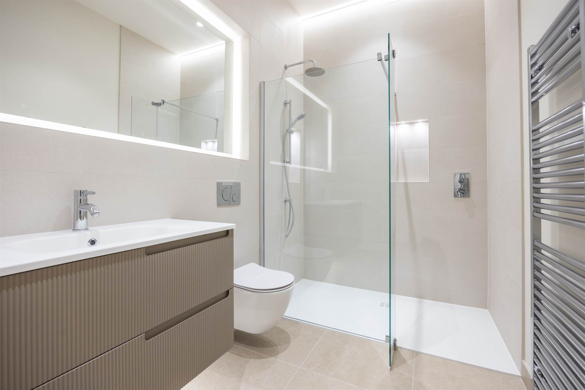 Walk in showers with fixed glazed screen or high-end pivot style shower doors