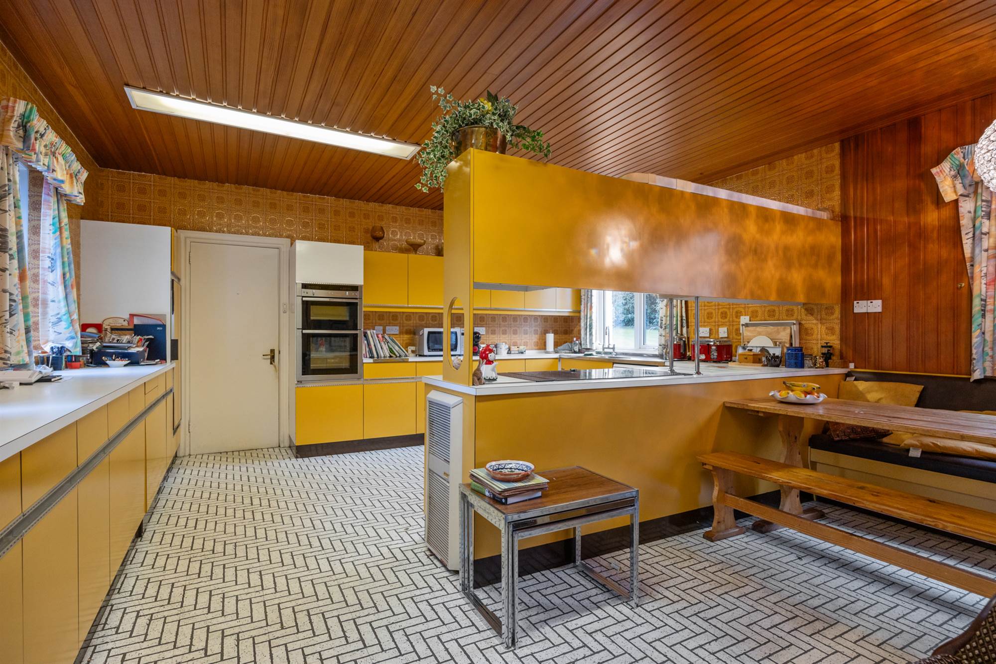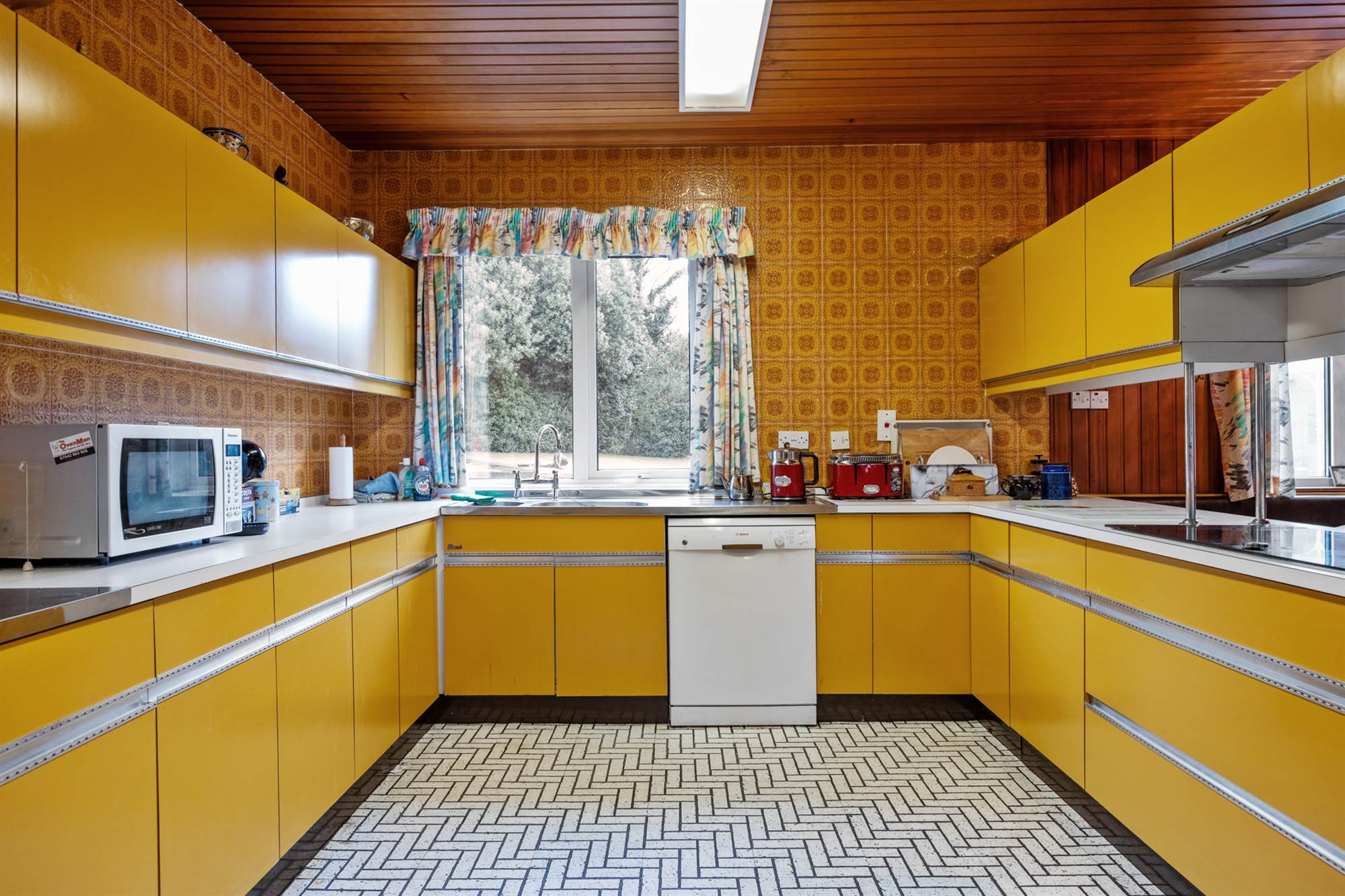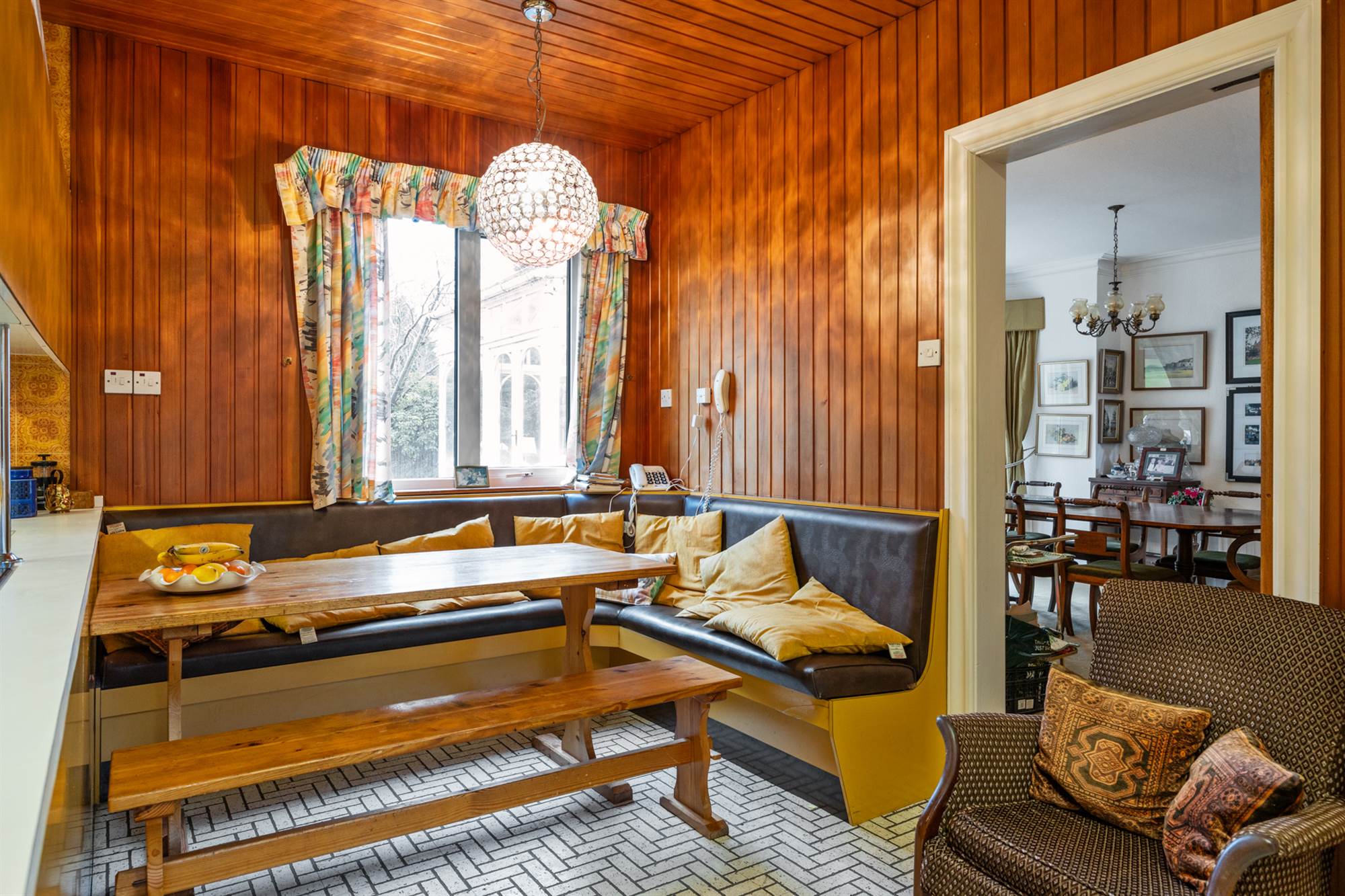 Excellent range of high and low level fitted units, stainless steel single drainer sink unit with mixer taps, integrated Neff double oven, plumbed for dishwasher, integrated fridge, Neff induction hob and stainless steel extractor hood, casual bench seating, dining area, partly tiled walls, tongue and groove panelled walls and ceiling, door to Dining Room. Door to Utility Room.