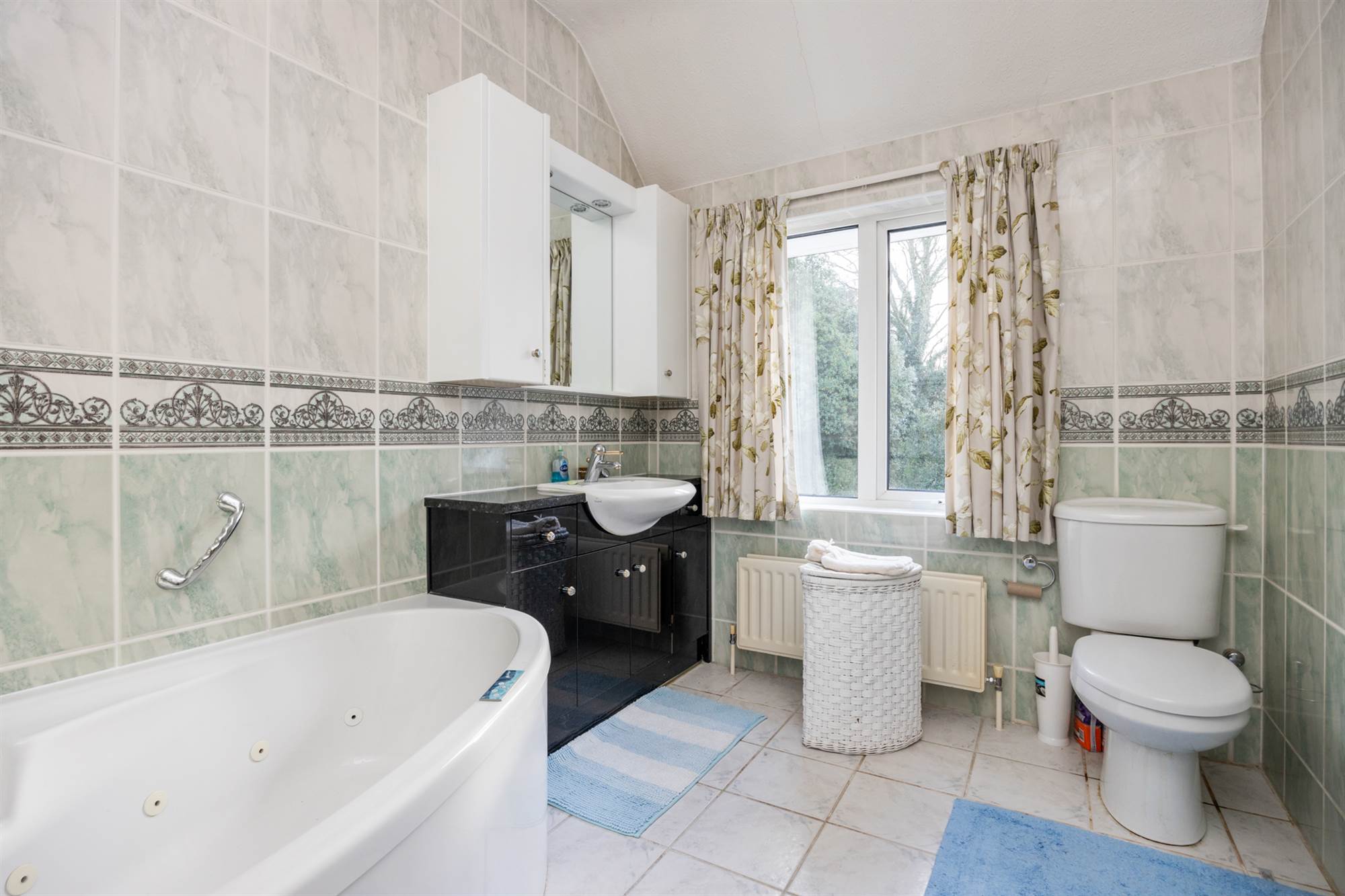 Low flush WC, wash hand basin with vanity storage below and above, corner jet bath with mixer taps, fully tiled corner shower with chrome thermostatic fitments, tiled floor, fully tiled walls, recessed lighting.