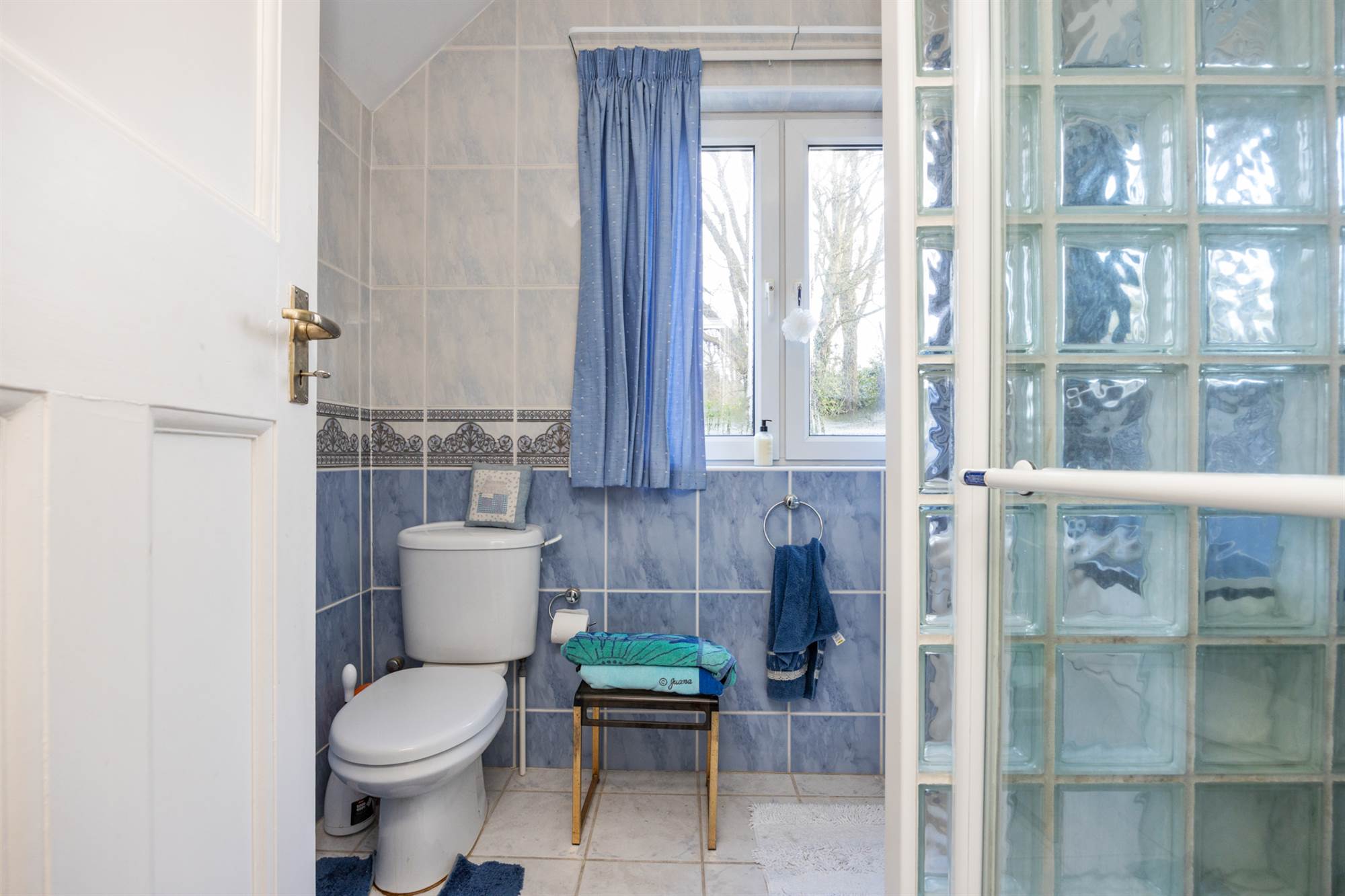 Low flush WC, wash hand basin with storage beneath, fully tiled shower with chrome thermostatic fitments, tiled floor, fully tiled walls, heated towel rail, recessed lighting.