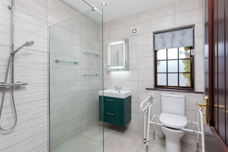 Large shower cubicle, thermostatically controlled shower unit with over drencher and telephone shower, wall mounted sink unit with cabinets below, mixer tap, low flush wc, wall mounted back light mirror, fully tiled walls, ceramic tiled floor, low voltage lighting.