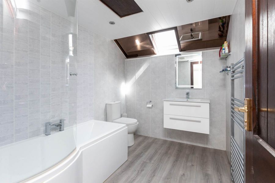 White suite comprising shower bath with thermostatically controlled shower unit with over drencher and telephone shower, mixer taps, low flush wc, contemporary wall mounted sink unit with mixer tap and cabinet below, fully tiled walls, low flush wc, chrome heated towel radiator, PVC ceiling, extractor fan, wall mounted back light mirror.