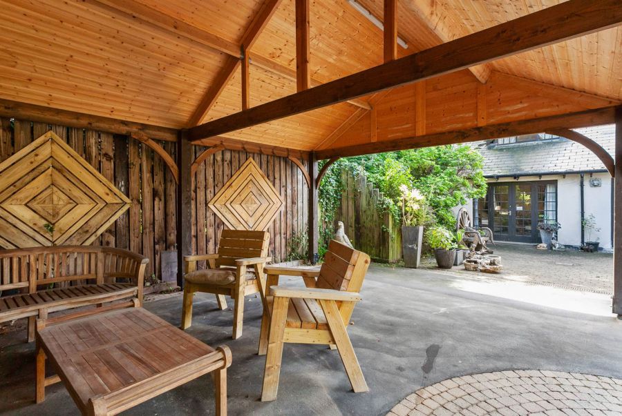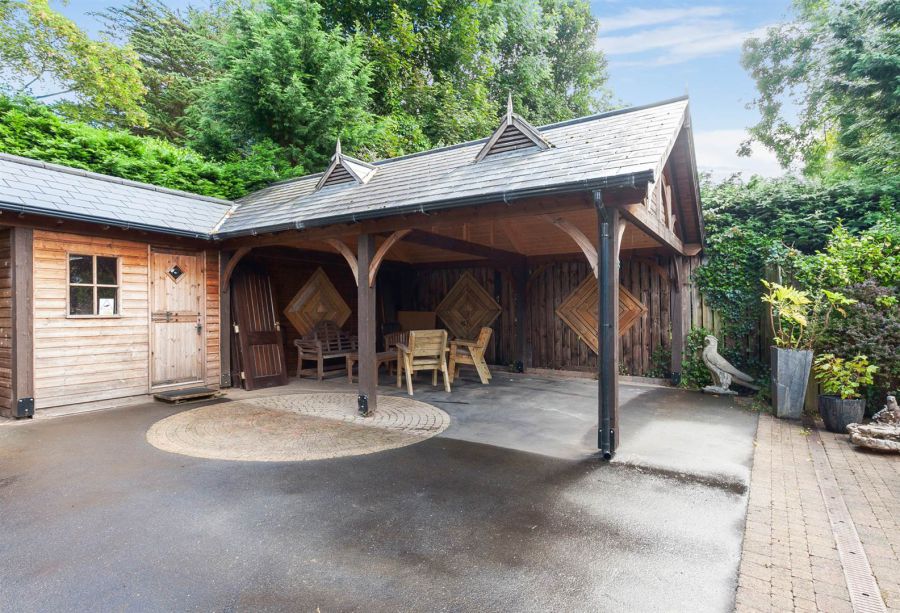 Ornate country style carport with feature beams and lighting for two cars plus additional storeroom
