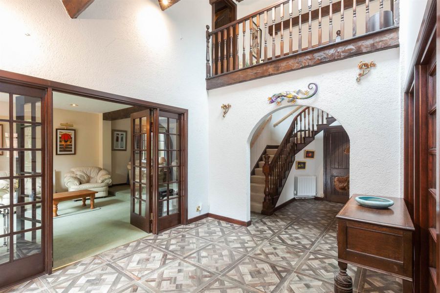 With vaulted ceiling and minstrel gallery, wood effect tiled floor, double glazed Velux window. Staircase to the first floor with matching spindles, handrails and Newel post. Cloaks cupboard, large pantry area with shelving and Worcester Bosch gas boiler.