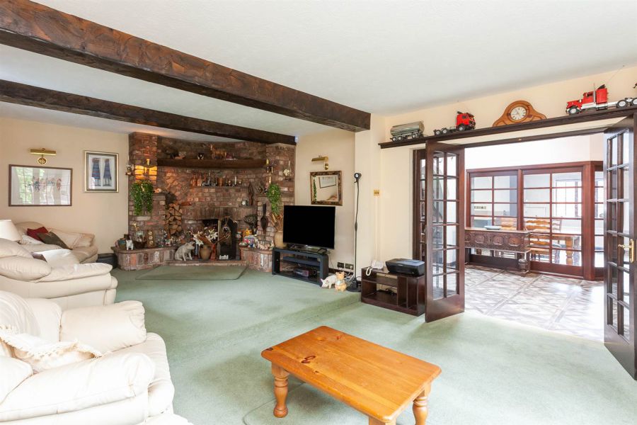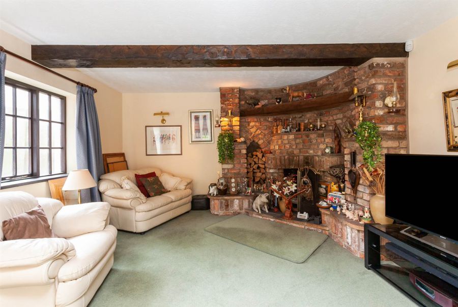 Feature corner reclaimed brick fireplace, solid wood mantle and quarry tiled hearth, wall lighting, feature oak beams, glazed double doors and side lights to courtyard, glazed double doors and side lights to entrance hall.