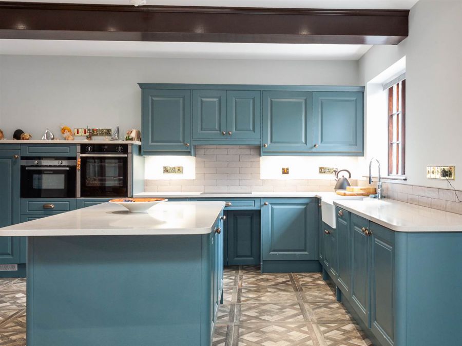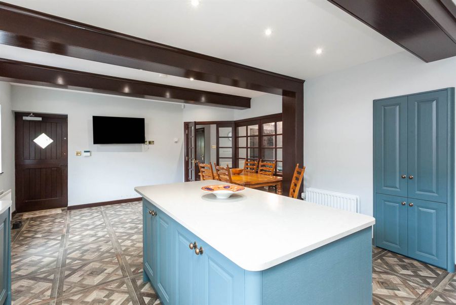 Contemporary hand painted shaker style high and low level kitchen units, under unit lighting, Quartz worktops with double inset sink unit, Quooker hot water tap, tiled splashback, four ring Hotpoint hob, concealed extractor above, eye level Neff oven with Nordmende eye level micro oven, integrated lower fridge, separate freezer and dishwasher plus, integrated wine fridge and washing machine, central island with breakfast bar area, matching worktop and additional storage, feature beams, wood effect tiled floor, low voltage lighting.