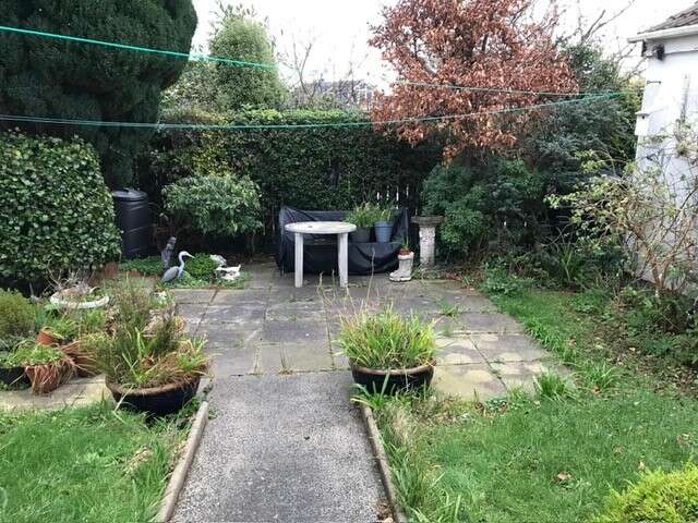 Rear garden in lawn with patio area, mature shrubs and outside tap.