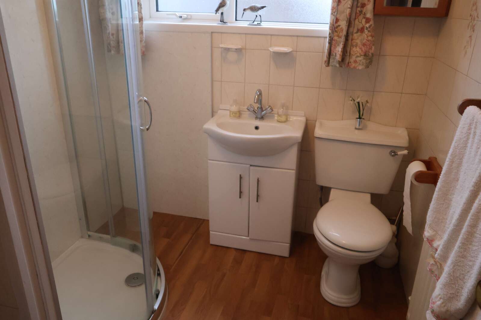 2.3m x 1.9m ivory coloured suite with toilet and wash hand basin, corner shower, part-tiled walls and towel cupboards just off.