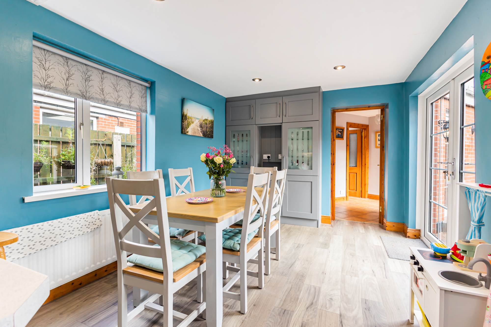 The ground floor begins with a welcoming entrance hall that leads into a bright and comfortable lounge, perfect for relaxing evenings. A second, separate living room offers additional space for entertaining, family use, or a home office. The heart of the home is the well appointed kitchen, which opens to a generous dining area, ideal for family meals and social gatherings. A useful utility room sits just off the kitchen, adding convenience and extra storage.