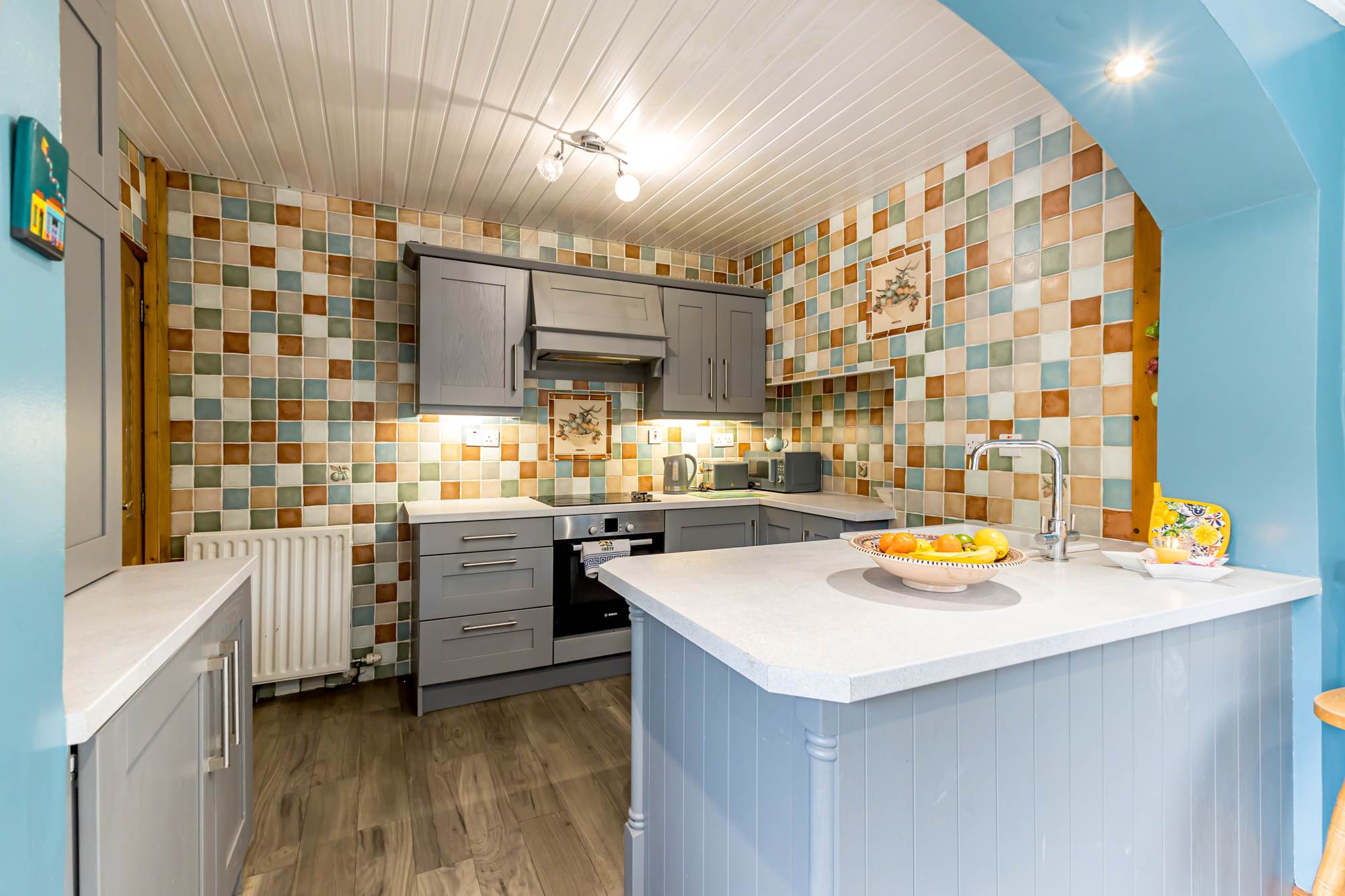 High and low level units, integrated four ring hob and electric underbench oven, ceramic sink unit, laminate work surfaces, integrated dishwasher.
