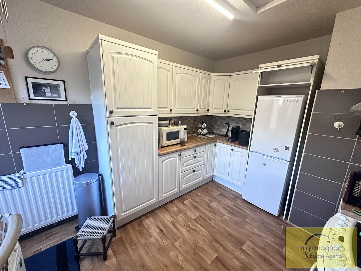 Fully fitted kitchen comprising high and low level units, formica work surfaces, stainless steel sink drainer, plumbed for washing machine, vinyl flooring, part tile walls