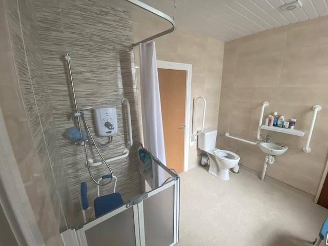 Comprising fully tiled electric shower, whb and wc, hotpress, storage cupboard, extractor fan, fully tiled walls.