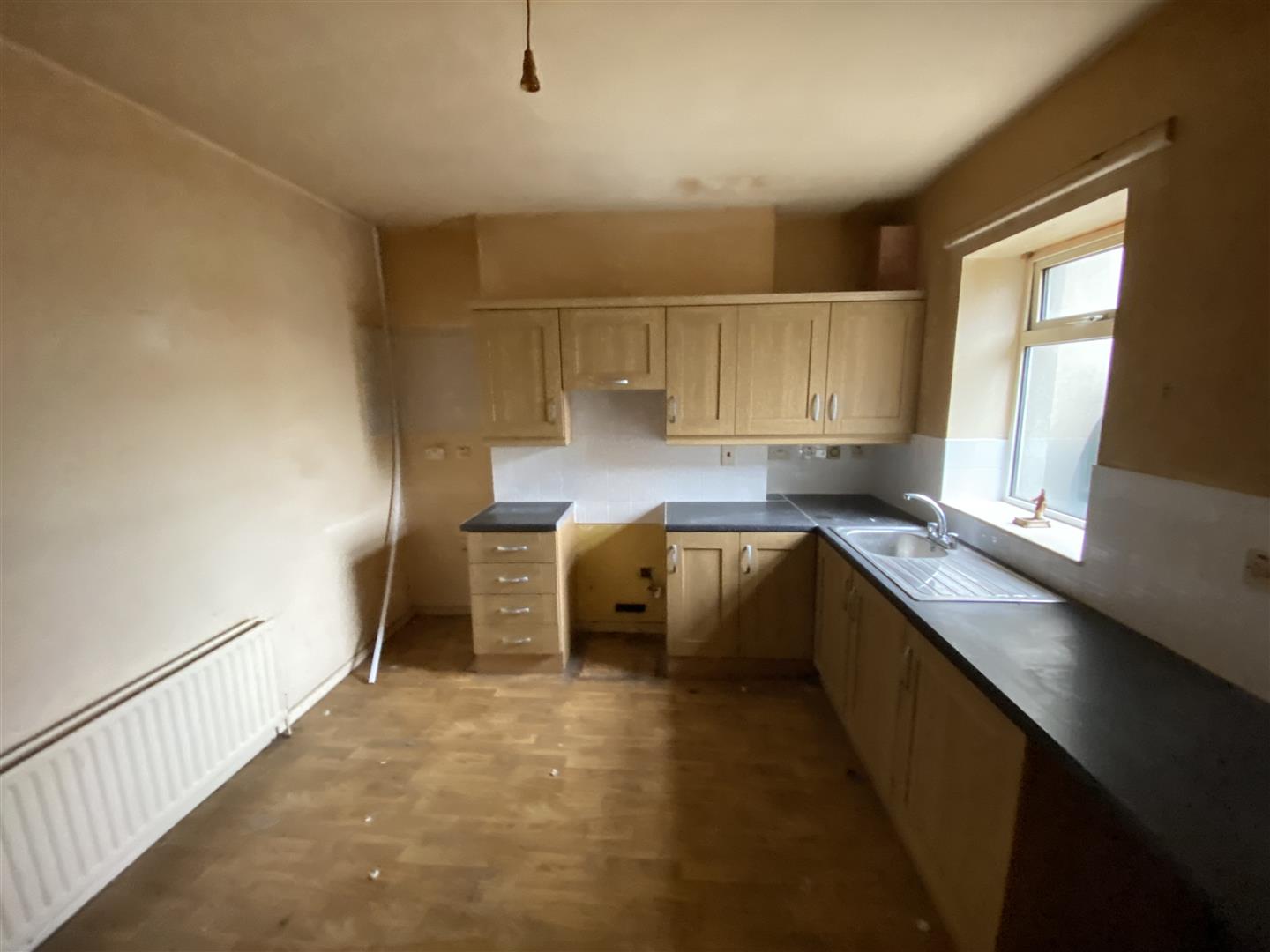 Having eye and low level units, tiling between units, single drainer stainless steel sink unit with mixer taps, space for cooker and fridge / freezer, plumbed for washing machine, understairs storage.