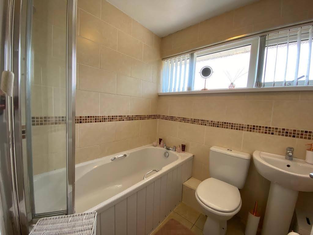 Comprising bath with electric shower over, shower screen, whb and wc, fully tiled walls and floor.