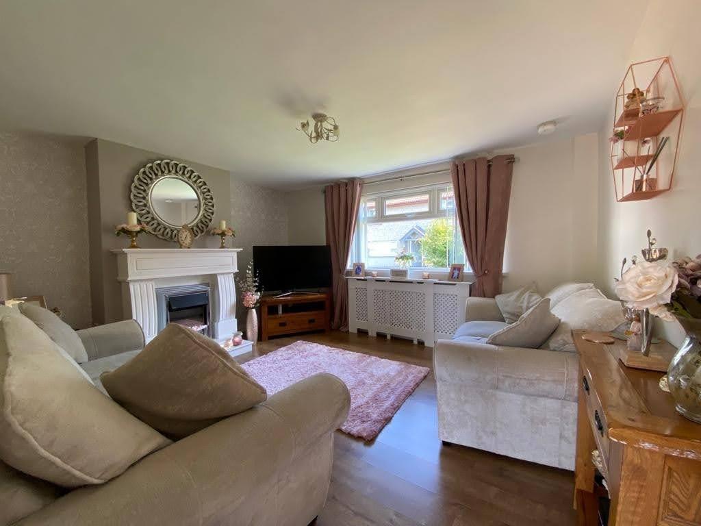 Neat lawn to front bordered by fence and gate.