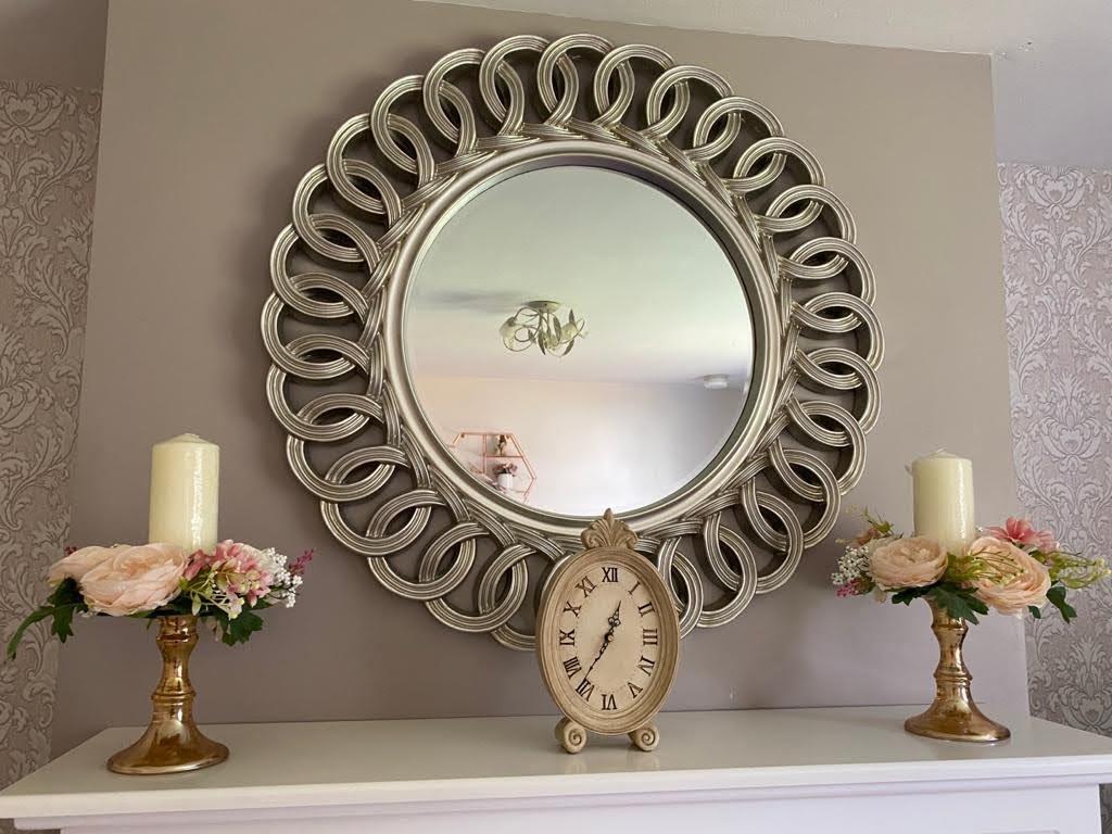Having ornamental fireplace with lighting, laminated wooden floor.