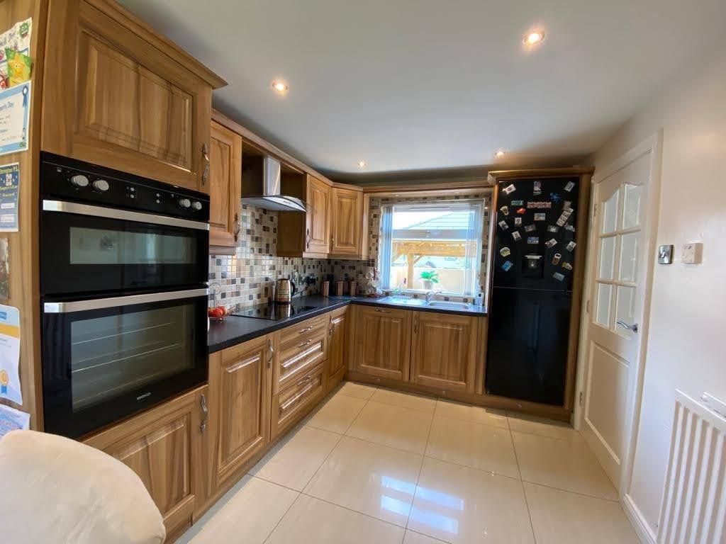 Having range of eye and low level units, matching pelmet over window with concealed lighting under, tiling between units, single drainer stainless steel sink unit with mixer taps, hob, double oven, stainless steel extractor hood, space for fridge/freezer, recessed lighting, ample dining space, tiled floor, door with glass panels to hall.