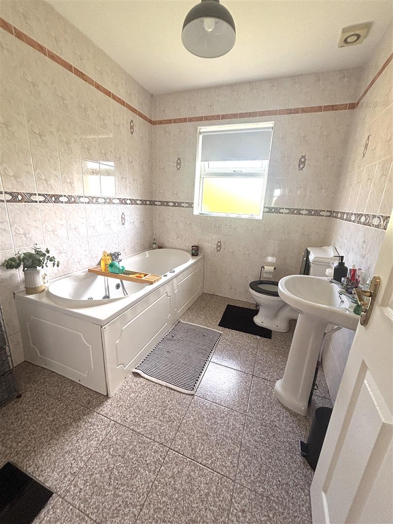 With a fitted white bath with shower attachment over bath. Pedestal wash hand basin. Low Flush W.C. Extractor fan. Tiled flooring. Tiled walls.