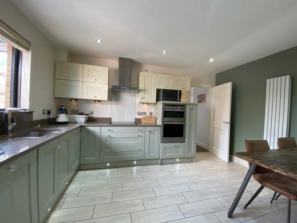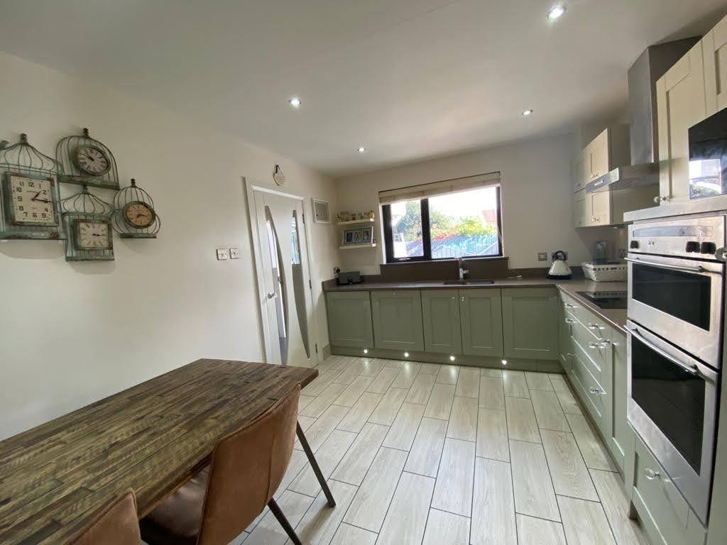 Having range of eye and low level units, 1 1/2 bowl stainless steel sink unit set in Quartz worktop with matching splashback, hob, double oven, stainless steel extractor hood, integrated fridge and dishwasher, dining space, recessed ceiling lighting, skirting lighting, tiled floor.