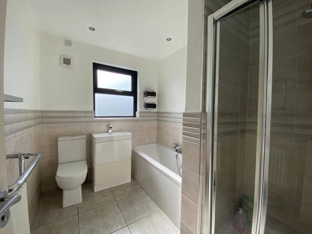 Comprising tiled walk in shower, whb and wc, chrome radiator, tiled floor.