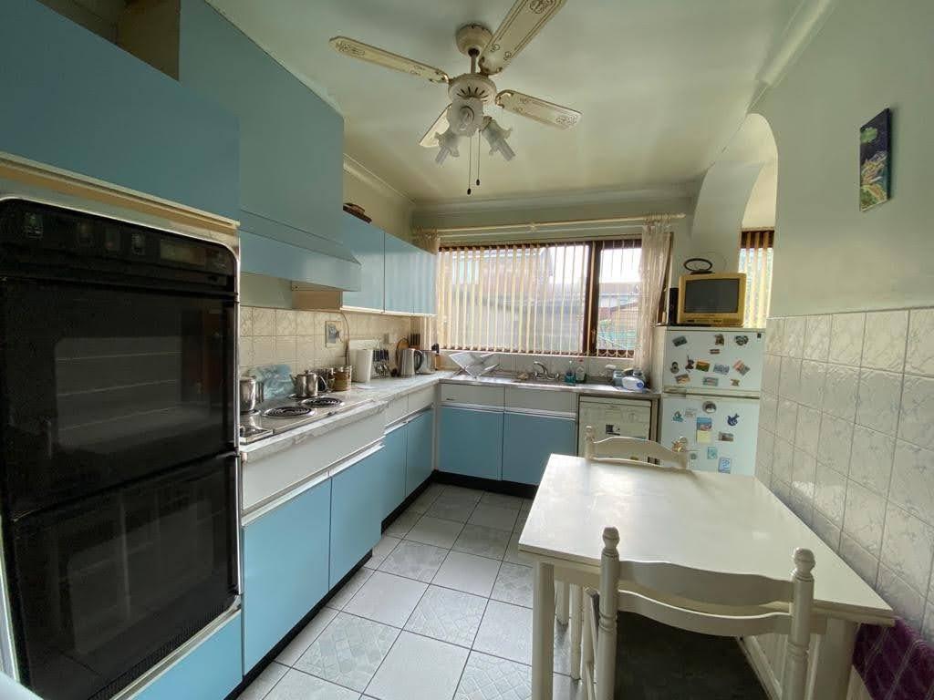 Having eye and low level units, tiling between units, double drainer stainless steel sink unit, hob, double oven, tiled floor, open plan to Dining area 9'10" x 8'6" having built in cupboard, tiled floor and patio doors leading to rear.