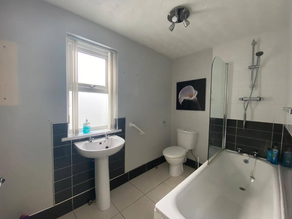 Comprising bath with shower over, shower screen, whb and wc, tiled floor.