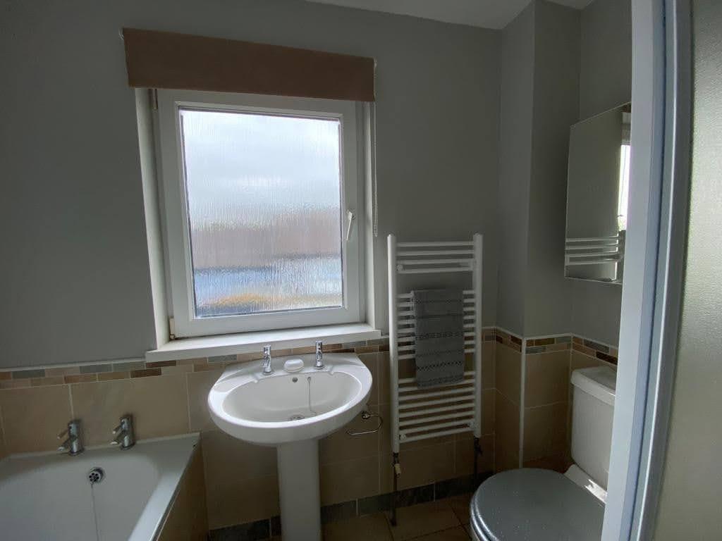 Comprising bath, whb and wc, walk in electric shower, 1/2 tiled walls, tiled floor.