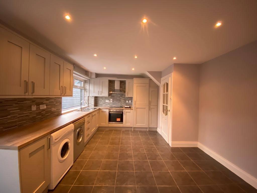 Having range of eye and low level units, tiling between units, 1 1/2 bowl stainless steel sink unit with mixer taps, hob, underoven, stainless steel extractor hood, plumbed for washing machine, space for tumble dryer, integrated fridge / freezer, ample dining space, French doors leading to rear, tiled floor.