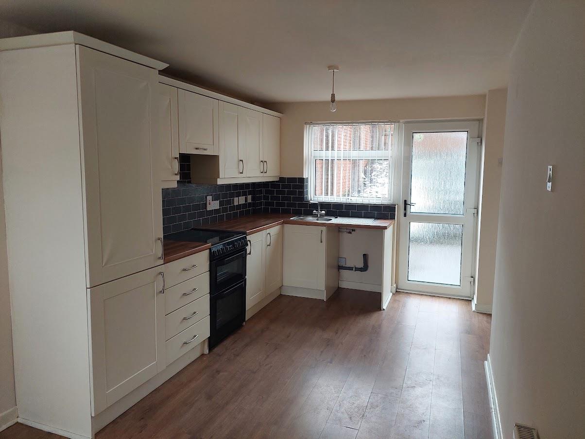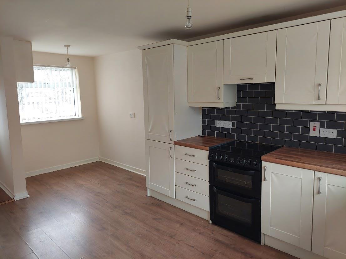 Having range of eye and lown level units, tiling between units, single drainer stainless steel sink unit with mixer taps, wired for cooker, plumbed for washing machine, space for fridge / freezer, understairs storage, laminated wooden floor.