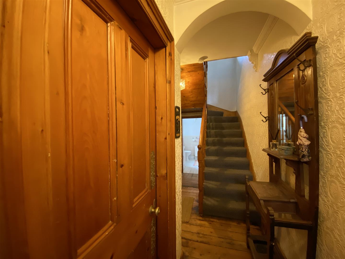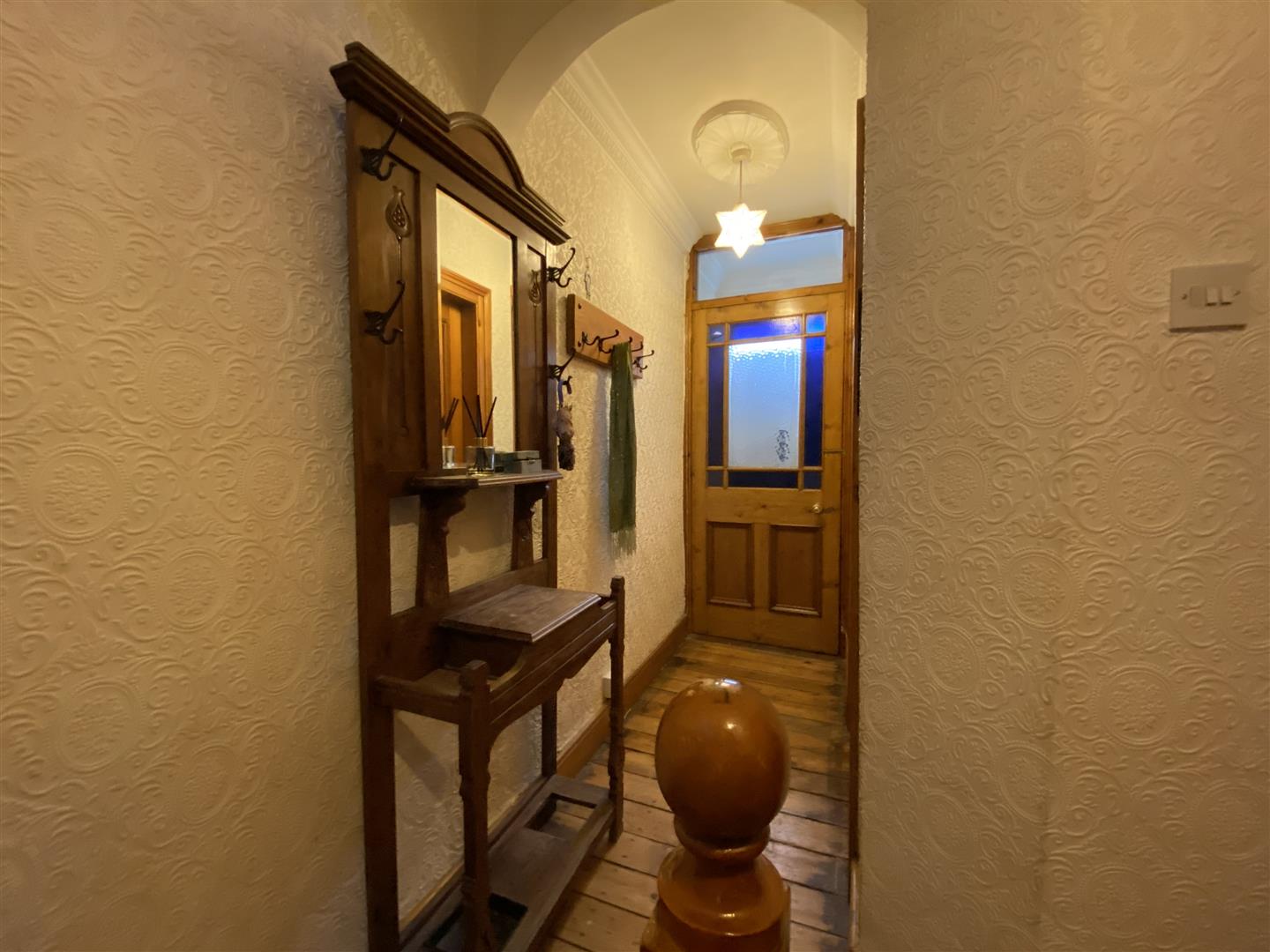 Having wooden floor, door with stained glass window leading to hall.