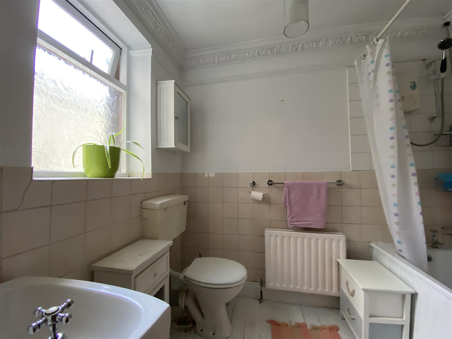 Comprising bath with shower over, whb and wc, 1/2 tiled walls.