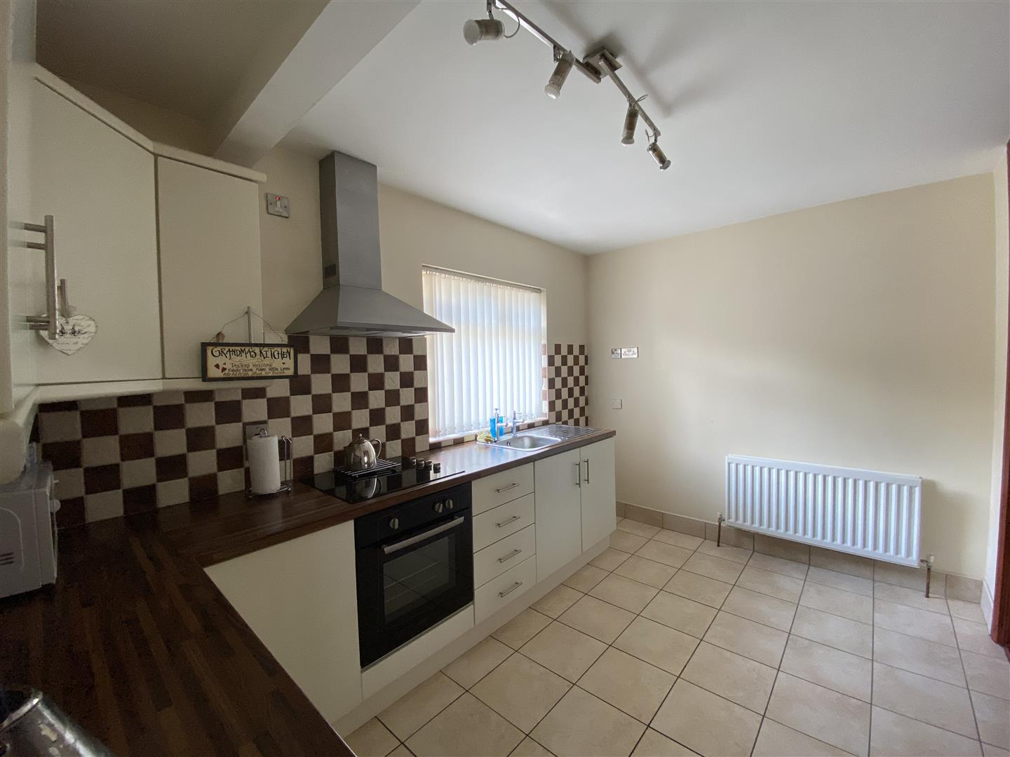 Having eye and low level units, tiling between units, single drainer stainless steel sink unit, hob, underoven, stainless steel extractor hood, plumbed for washing machine, tiled floor.