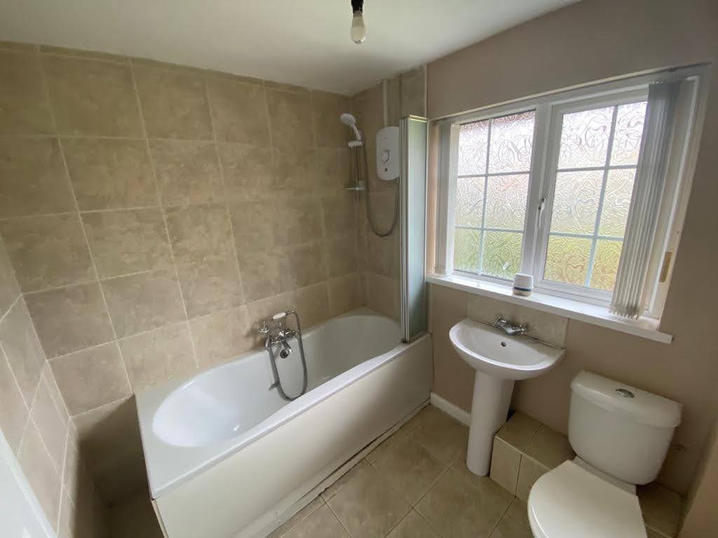 Comprising bath with electric shower over and part tiling around, shower screen, whb and wc, tiled floor.
