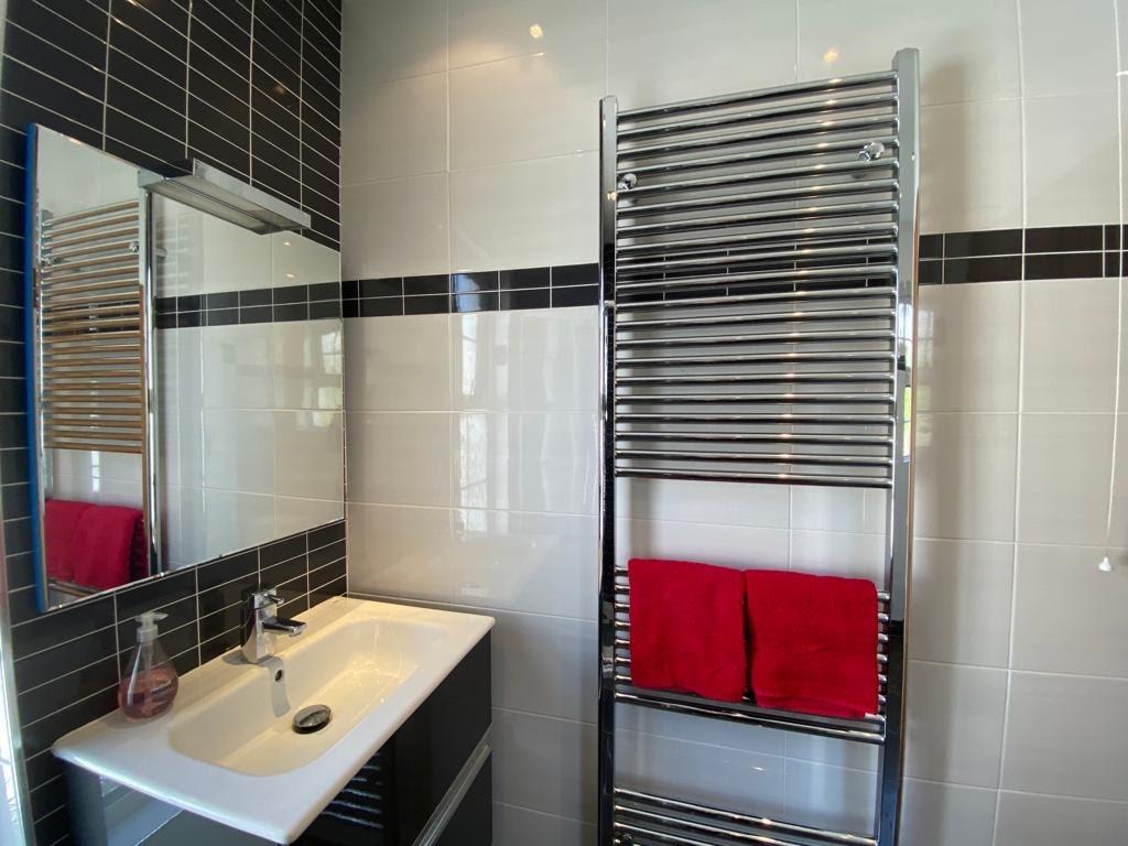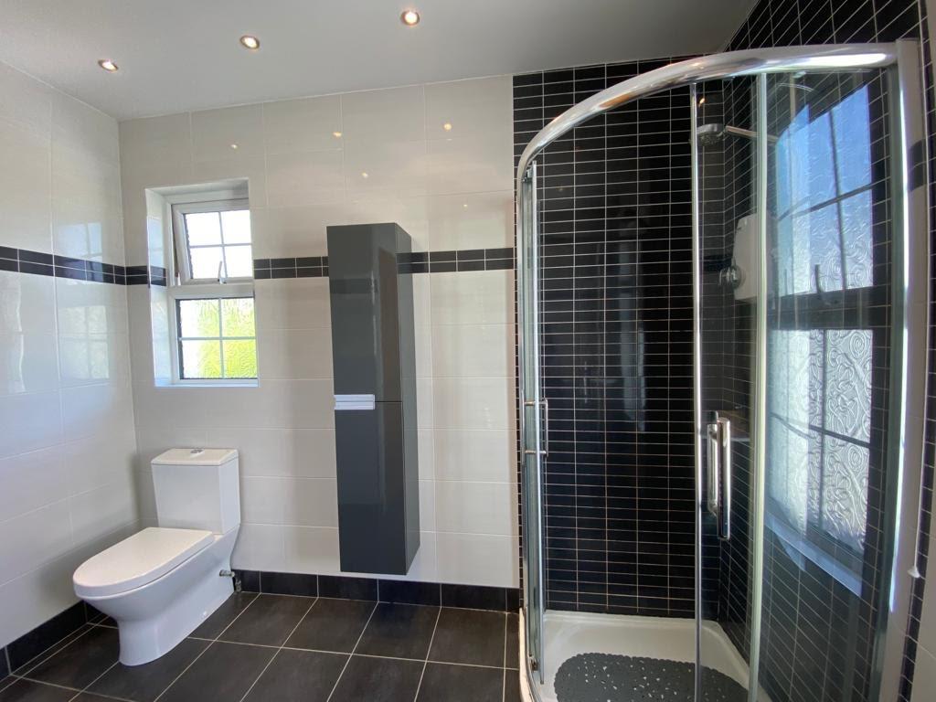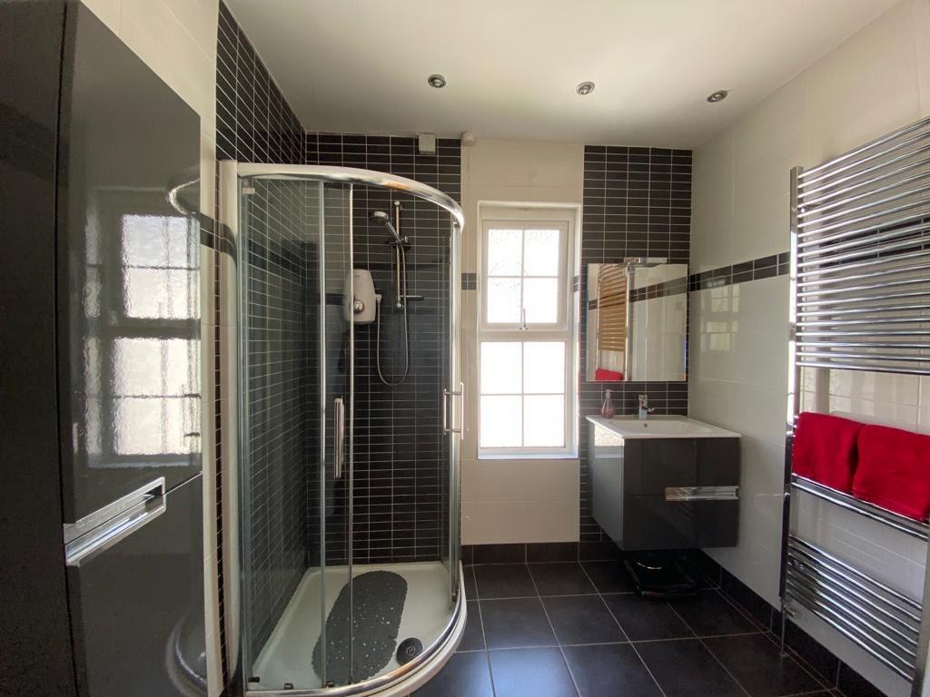 Comprising walk in electric shower, whb set in vanity unit, wc, fully tiled walls and floor, chrome radiator, recessed lighting.