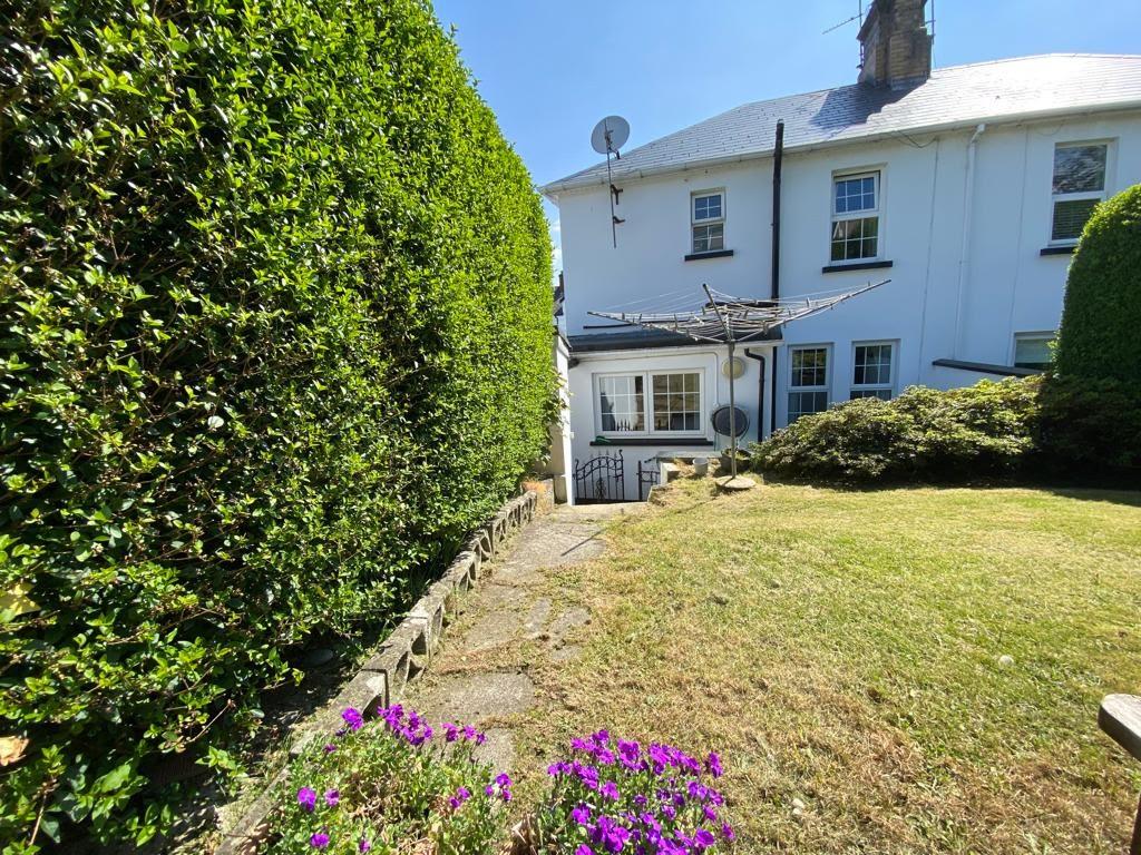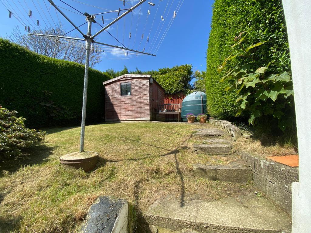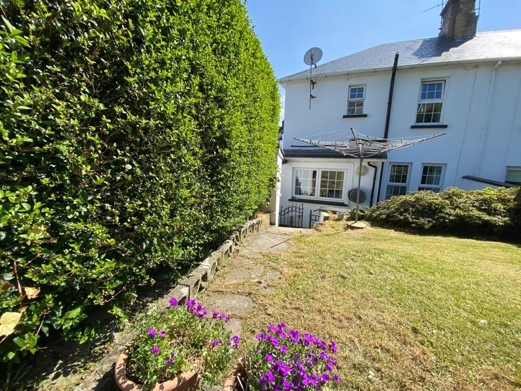 Neat lawn to front and side bordered by hedge.
