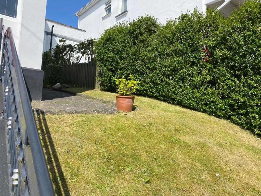 Enclosed concrete yard to rear leading to raised lawn.